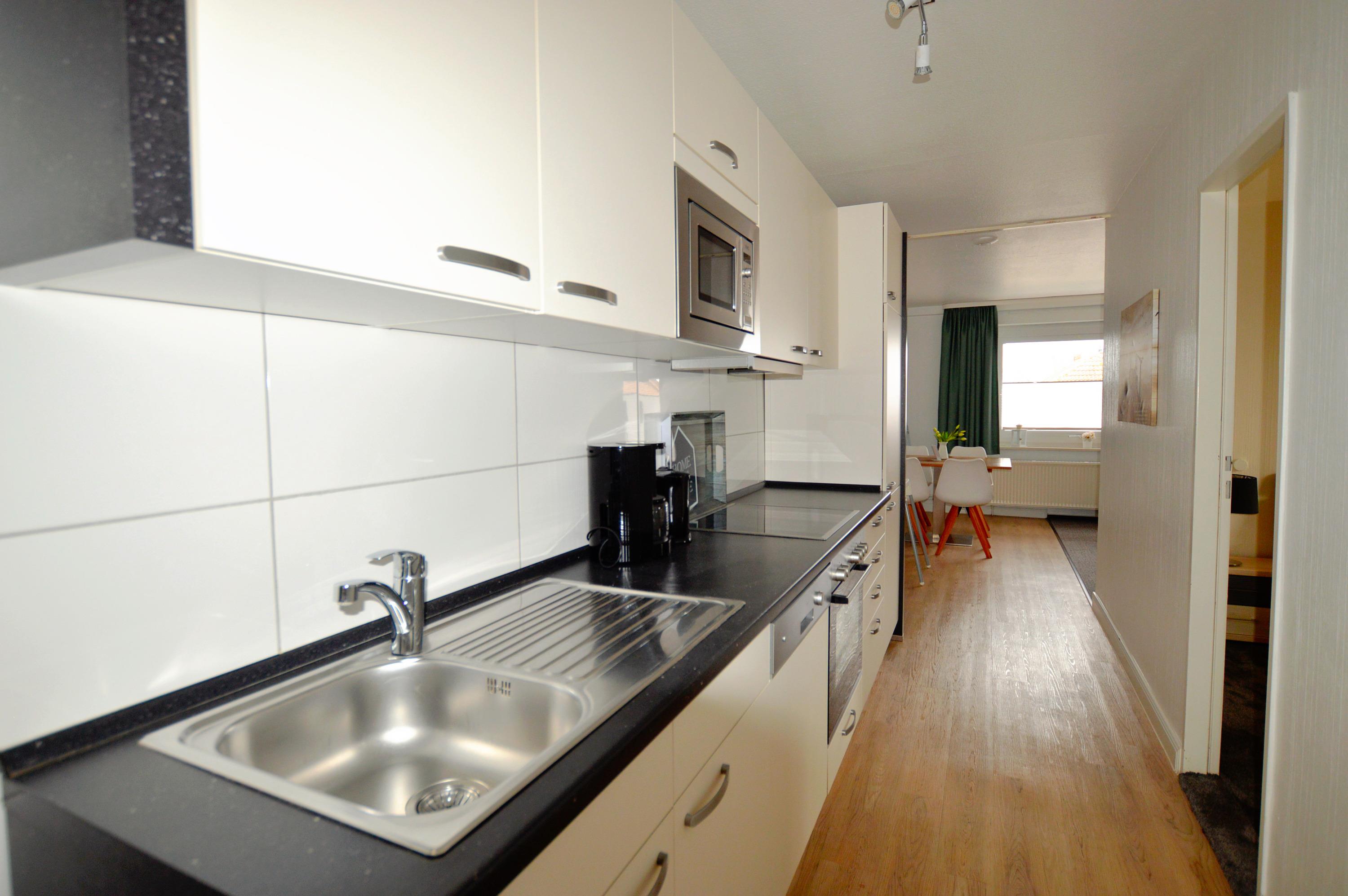 Ihre Wohnung erreichen Sie über das Treppenhaus. Sie befindet sich oben links im Gebäude. Durch den Küchenbereich betreten Sie Ihre Ferienwohnung. Von hier aus gehen die Schlafbereiche, wie auch das helle Wohn- Esszimmer ab. Aus dem Wohnbereich haben Sie Zugang zu Ihrem traumhaften Westbalkon. Von hier aus können Sie direkt in den Innenhof blicken und Ihren Kindern auf dem Spielplatz beim Spielen zusehen. Das ansprechende Duschbad ist mit einem Fenster ausgestattet.