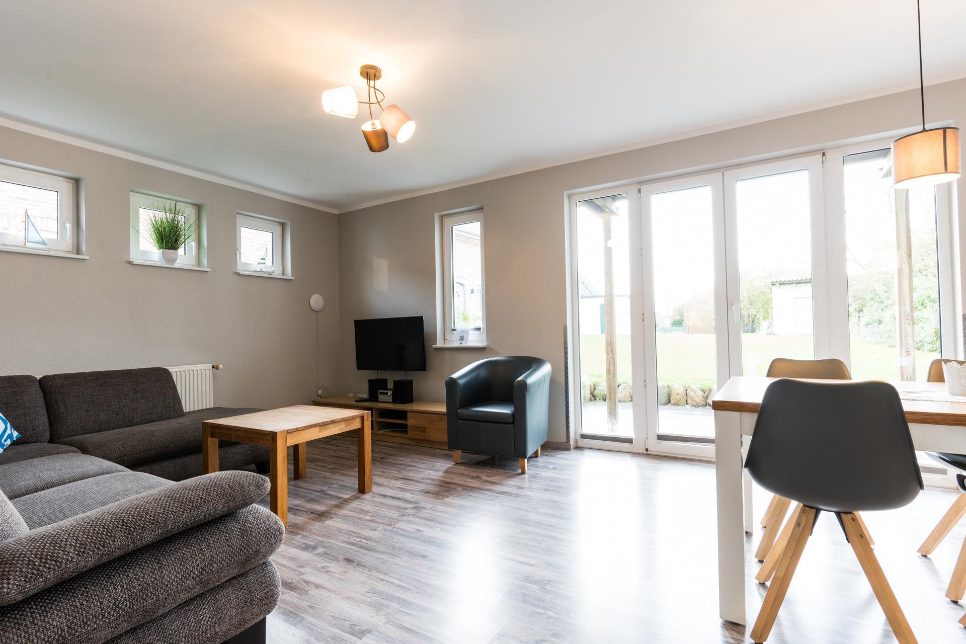 Im lichtdurchfluteten Wohn-Esszimmer erwarten Sie ein Flachbild-TV mit DVD-Player, ein Radio und ein CD-Player.