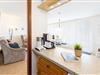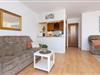 Nur rund 100 Meter vom Strand entfernt ... Das Wohnzimmer verfügt über bequeme Sitzgelegenheiten. Die offene Küche ist in den Wohnraum integriert. Dort befindet sich ein Herd mit Cerankochfeld, ein Backofen und ein Geschirrspüler. Das Highlight dieser Wohnung sind der Meerblick und die beiden Balkone. Der größere Balkon ist nach Osten ausgerichtet, hier haben Sie vom Frühstück bis zum Mittag die Sonne. Ab frühem Nachmittag bis zum Abend können Sie die Sonne auf dem kleineren West-Balkon genießen. Für die Nacht stehen Ihnen ein Schlafzimmer mit Doppelbett und ein weiteres Schlafzimmer mit Hochbett zur Verfügung. Eine 5. Schlafgelegenheit für ein Kind ist das ausziehbare Lattenrost mit Matratze unter dem Hochbett. Das hell geflieste Duschbad punktet mit einem Handtuchwärmer.