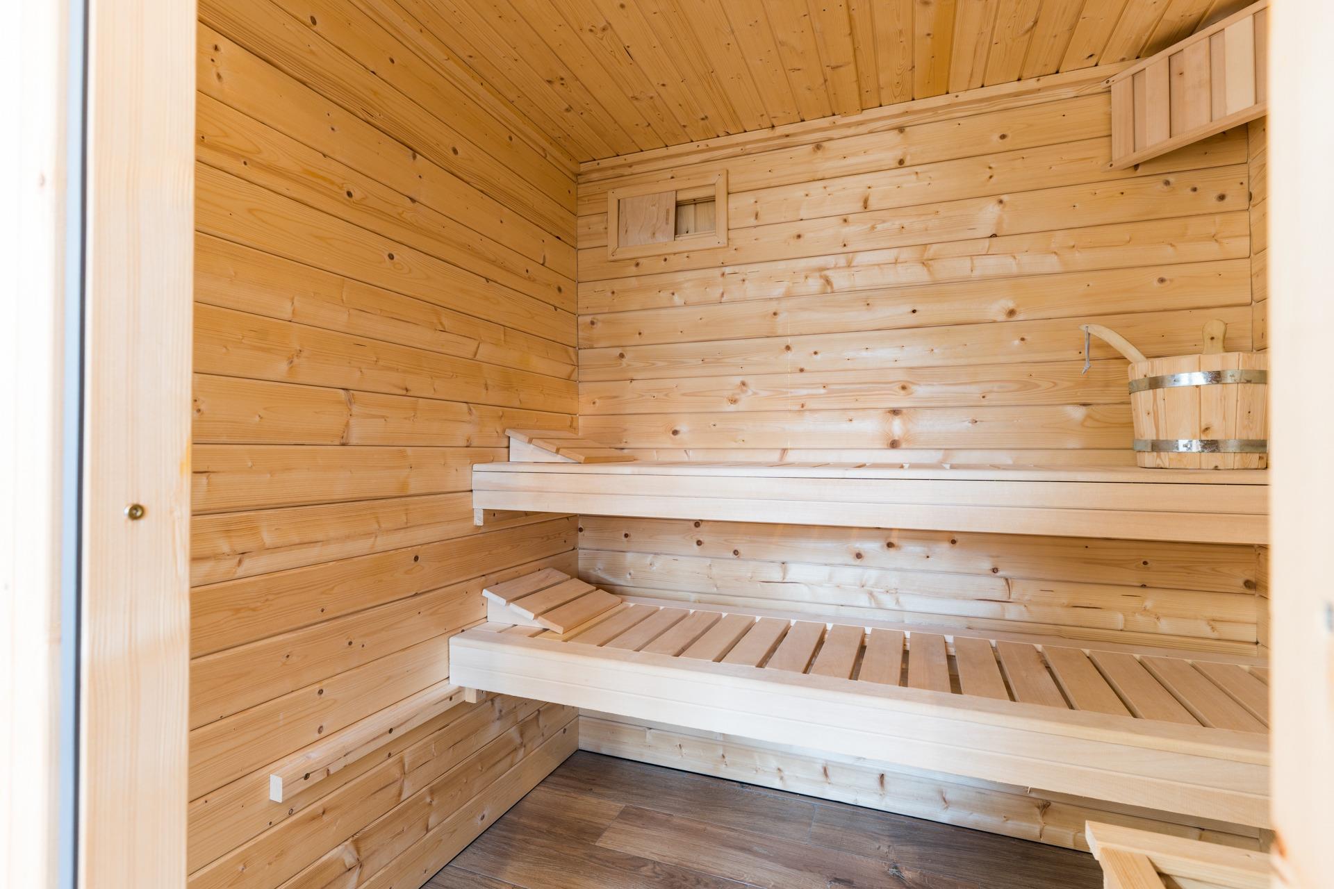 Zur Wohnung gehören außerdem ein Duschbad mit Sauna und ein Gäste-WC sowie eine Waschmaschine.