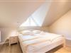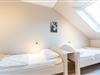 Ein Schlafzimmer mit 1 Doppelbett und ein Kinderzimmer mit 2 Einzelbetten befinden sich im Obergeschoss, ebenso ein Badezimmer mit Dusche.