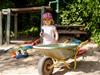 Die Südterrasse liegt im großen Garten, wo die Kinder Trampolin springen und Fußball spielen können.
