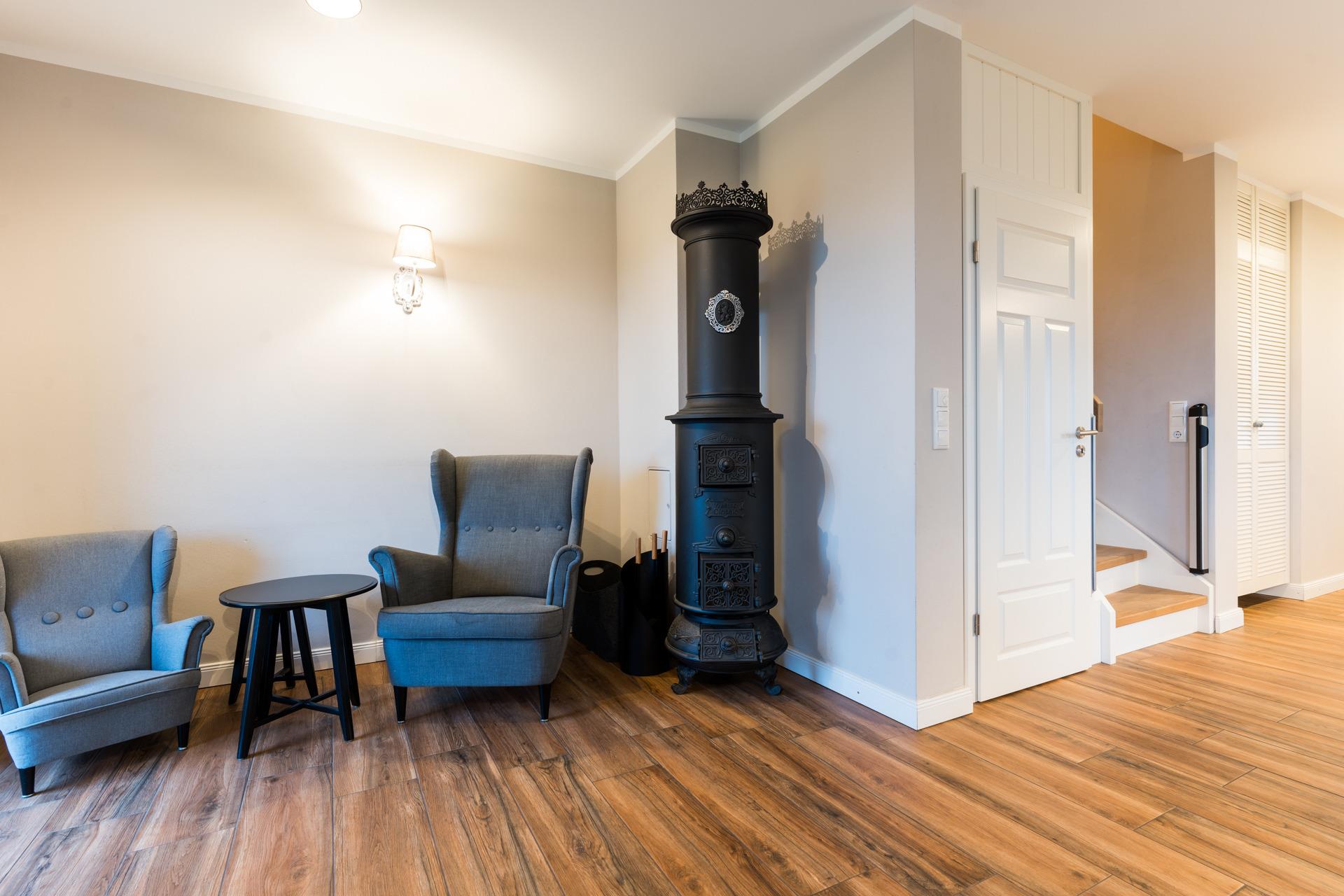 Im großzügigen Wohn-Esszimmer mit Kaminofen erwarten Sie ein Flachbid-TV mit DVD-Player, ein Radio und ein CD-Player.
