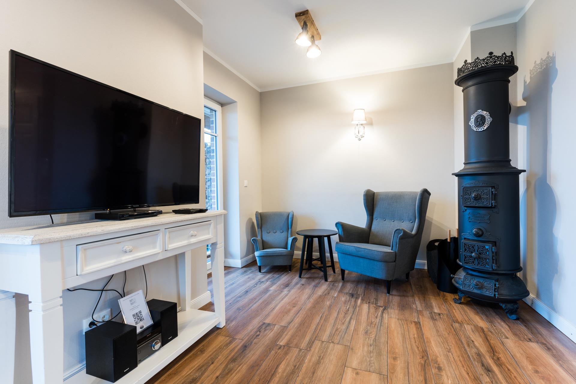 Im großzügigen Wohn-Esszimmer mit Kaminofen erwarten Sie ein Flachbid-TV mit DVD-Player, ein Radio und ein CD-Player.
