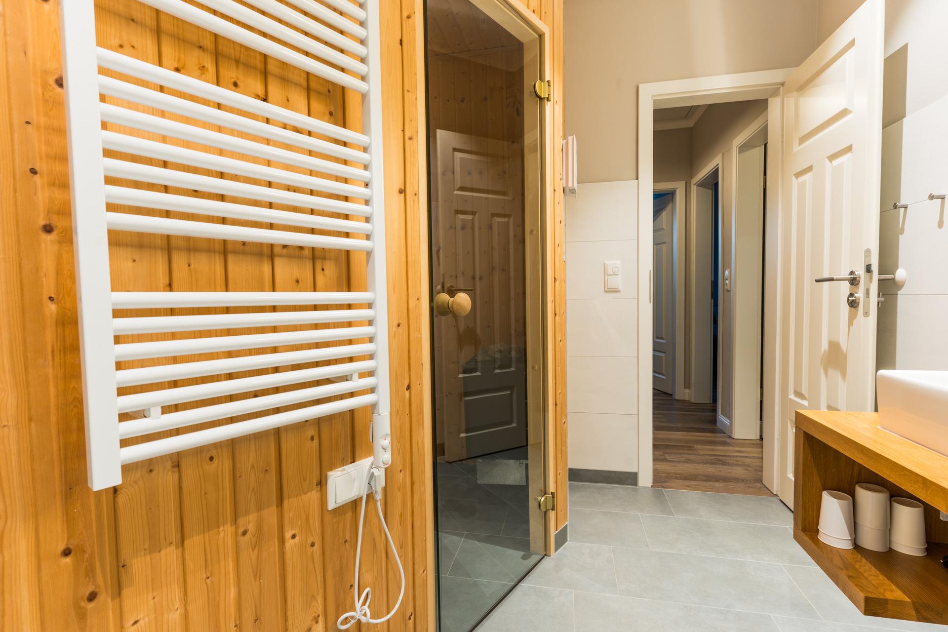 Im geräumigen Badezimmer befindet sich eine Sauna und eine Dusche mit Meeerblick!