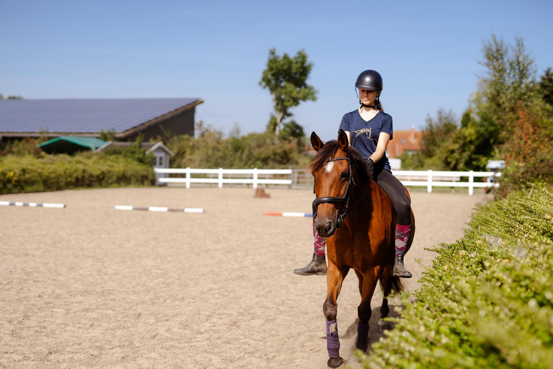 Die komfortablen Reethäuser liegen unmittelbar neben der Pferdeweide und unserer Reitanlage.