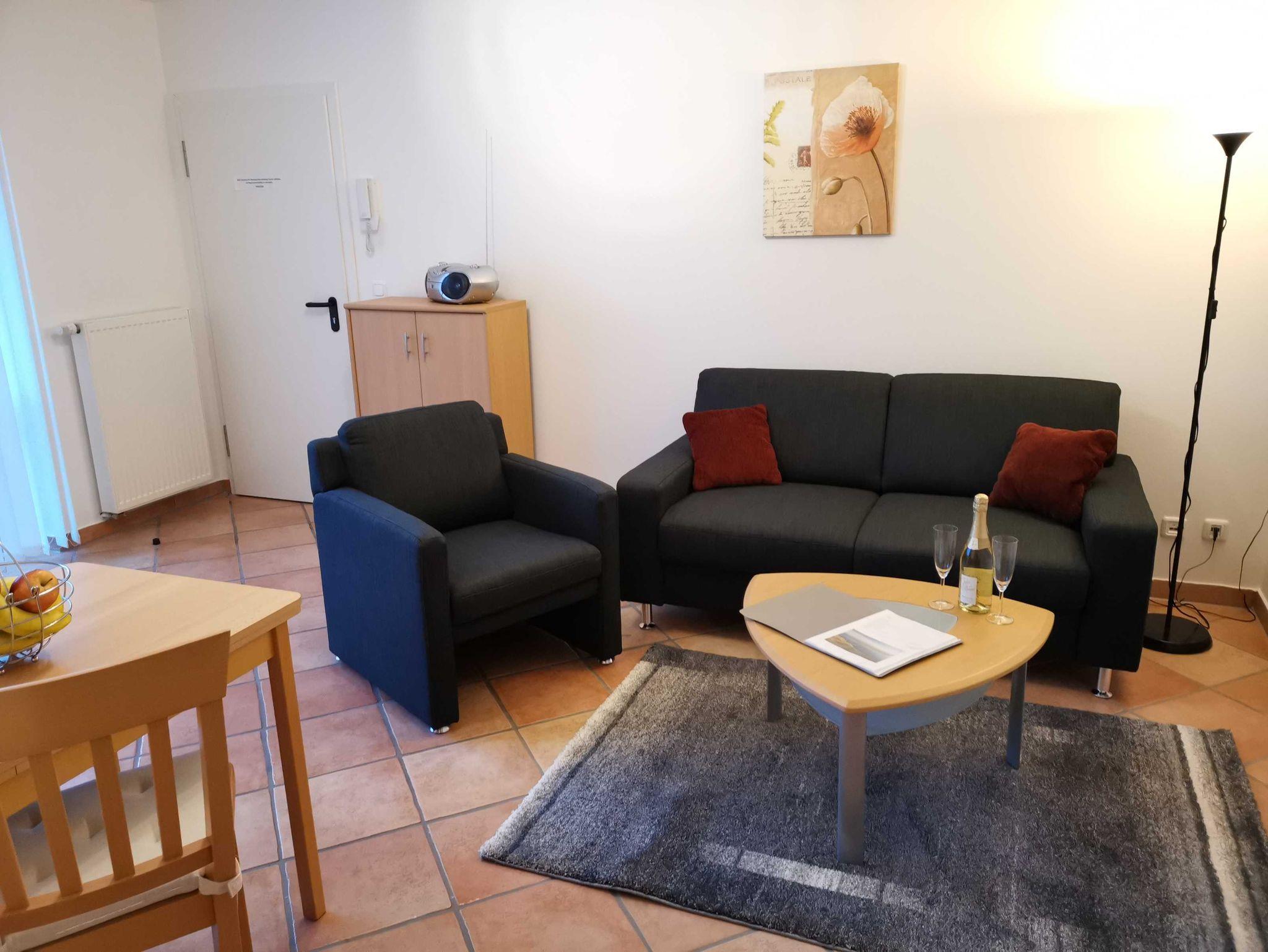 Die Ferienwohnung im Erdgeschoss ist mit ca. 33 qm für 2 Personen ausgelegt und verfügt über einen Wohnraum mit Küchenzeile, ein Bad mit Dusche und ein Schlafzimmer. Weitere Ausstattungsmerkmale: Sat-TV, Telefon kostenlos ( deutsches Festnetz außer Sondernummern ), PC-Anschluss DSL kostenlos, PKW-Stellplatz, Fahrradstellplatz, Waschmaschinennutzung, eigene Terrasse.