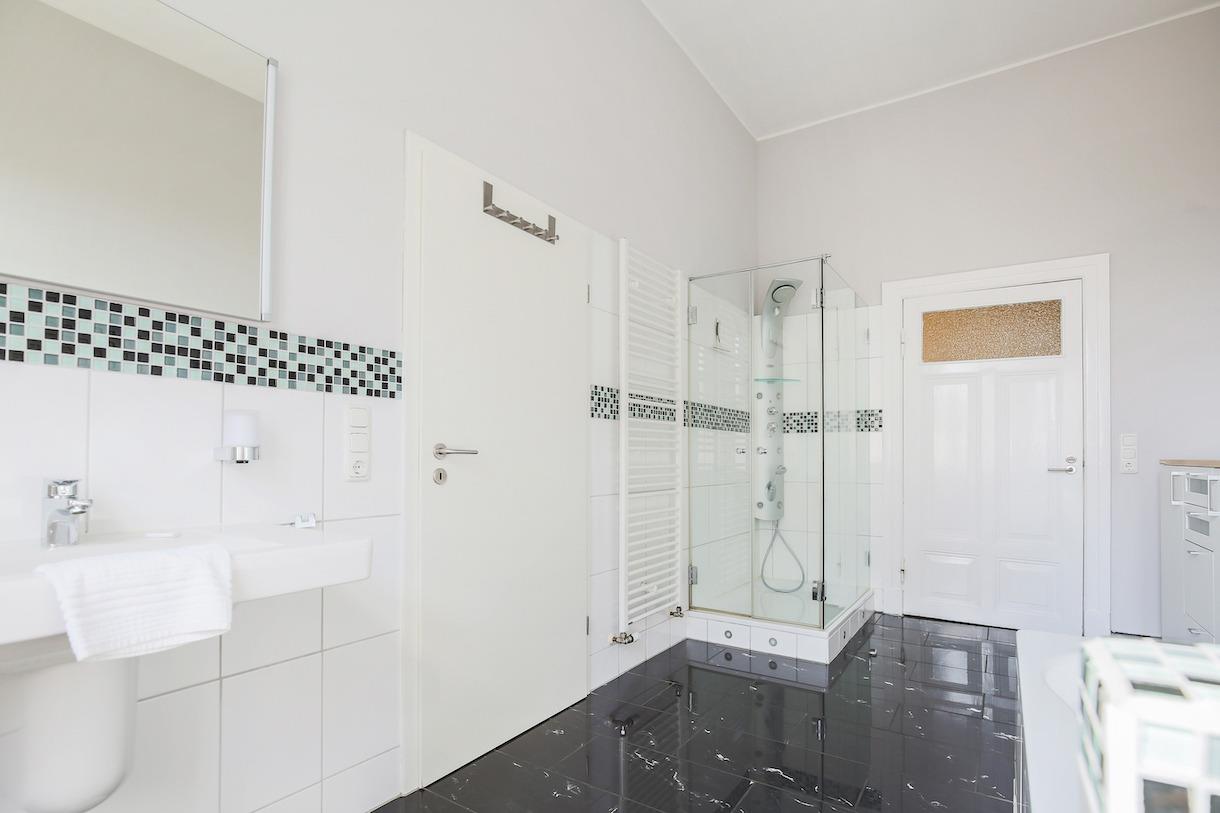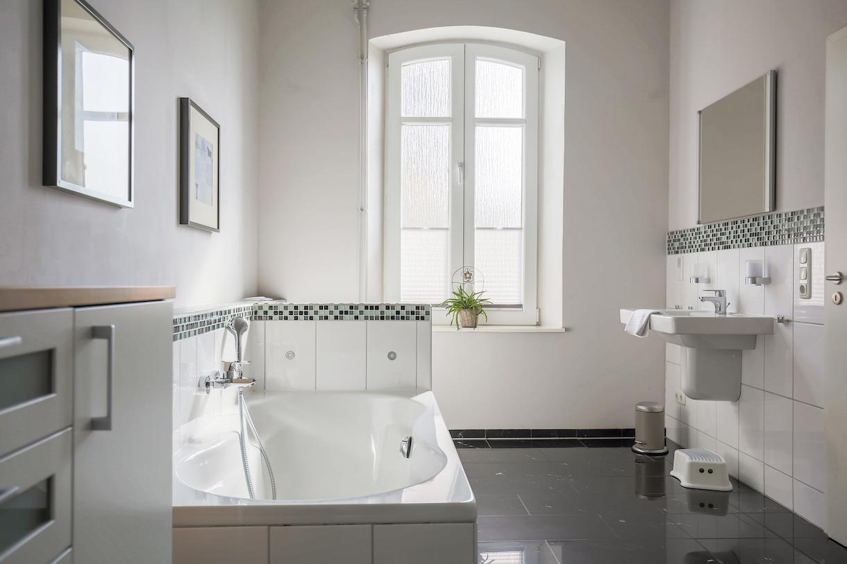 Bauers Haus (Erdgeschosswohnung - 220qm): Das historische und denkmalgeschütze Haus in modern renoviertem Ambiente bietet vier separate Schlafräume, ein Vollbad mit Zwei-Personen-Badewanne, Dusche und WC, ein Duschbad mit WC, einen separaten Speiseraum, eine großzügige und voll ausgestattete Küche, ein geräumiges Wohnzimmer und einen Wintergarten mit Zugang zum Spielplatz. Meerblick und Blick auf die Ponyweide inklusive. Die Wohnung ist vom DTV mit vier Sternen ausgezeichnet.