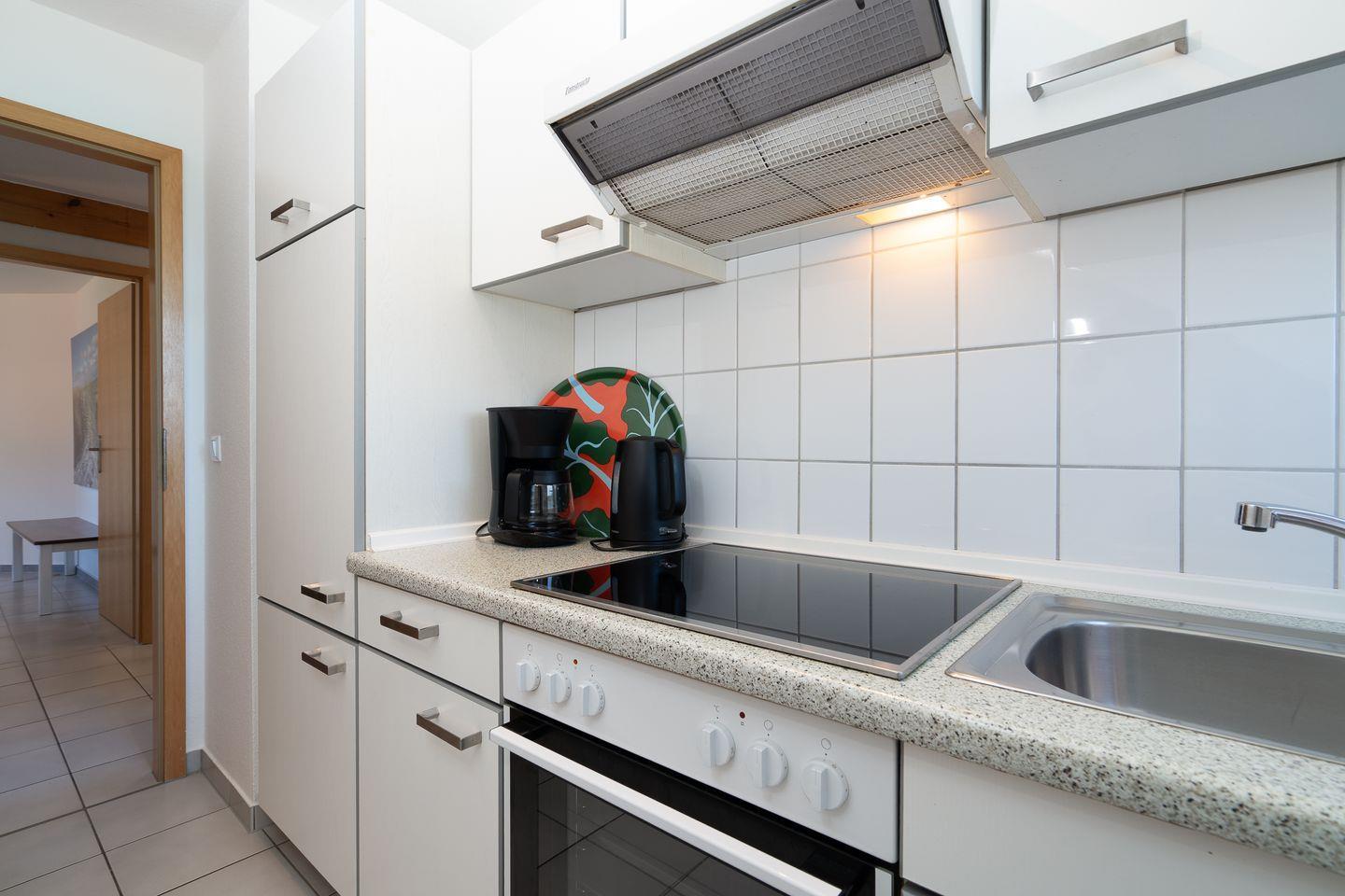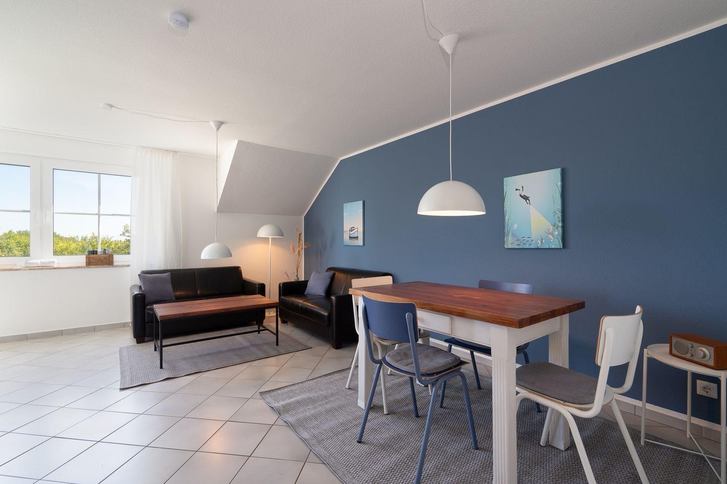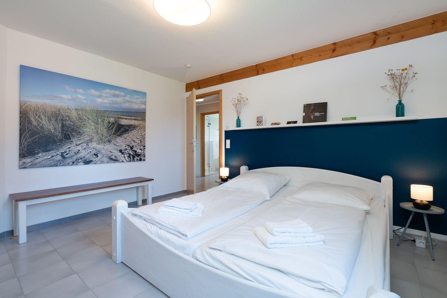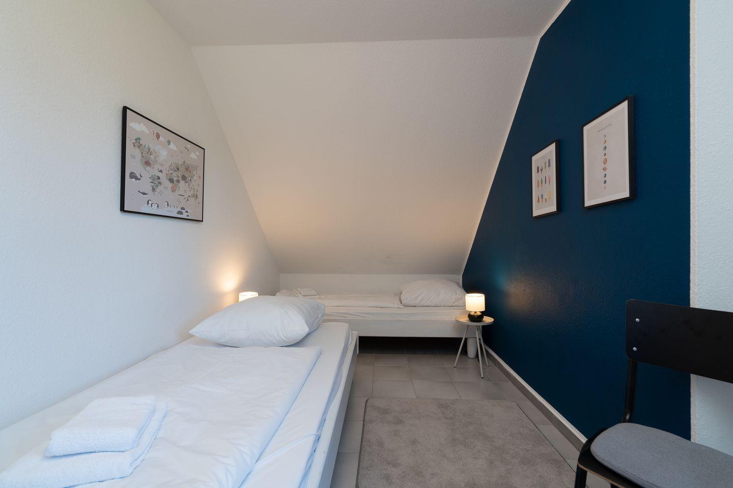 Die Wohnung hat zwei Schlafzimmer, eines als Elternschlafzimmer mit einem Doppelbett und eines als Kinderzimmer mit zwei großen Einzelbetten und Babybett. Erfreuen Sie sich an der umfangreichen Ausstattung, die Dank LTE und separater Zimmer auch einen verlängerten Aufenthalt mit mobile Working/ Workation ermöglicht. Ein dänischer Ofen für die Übergangszeit bringt im Wohn-/Essbereich ebenfalls erholsame Gemütlichkeit.