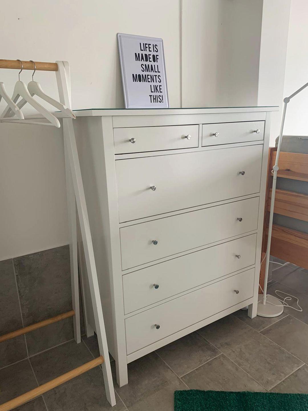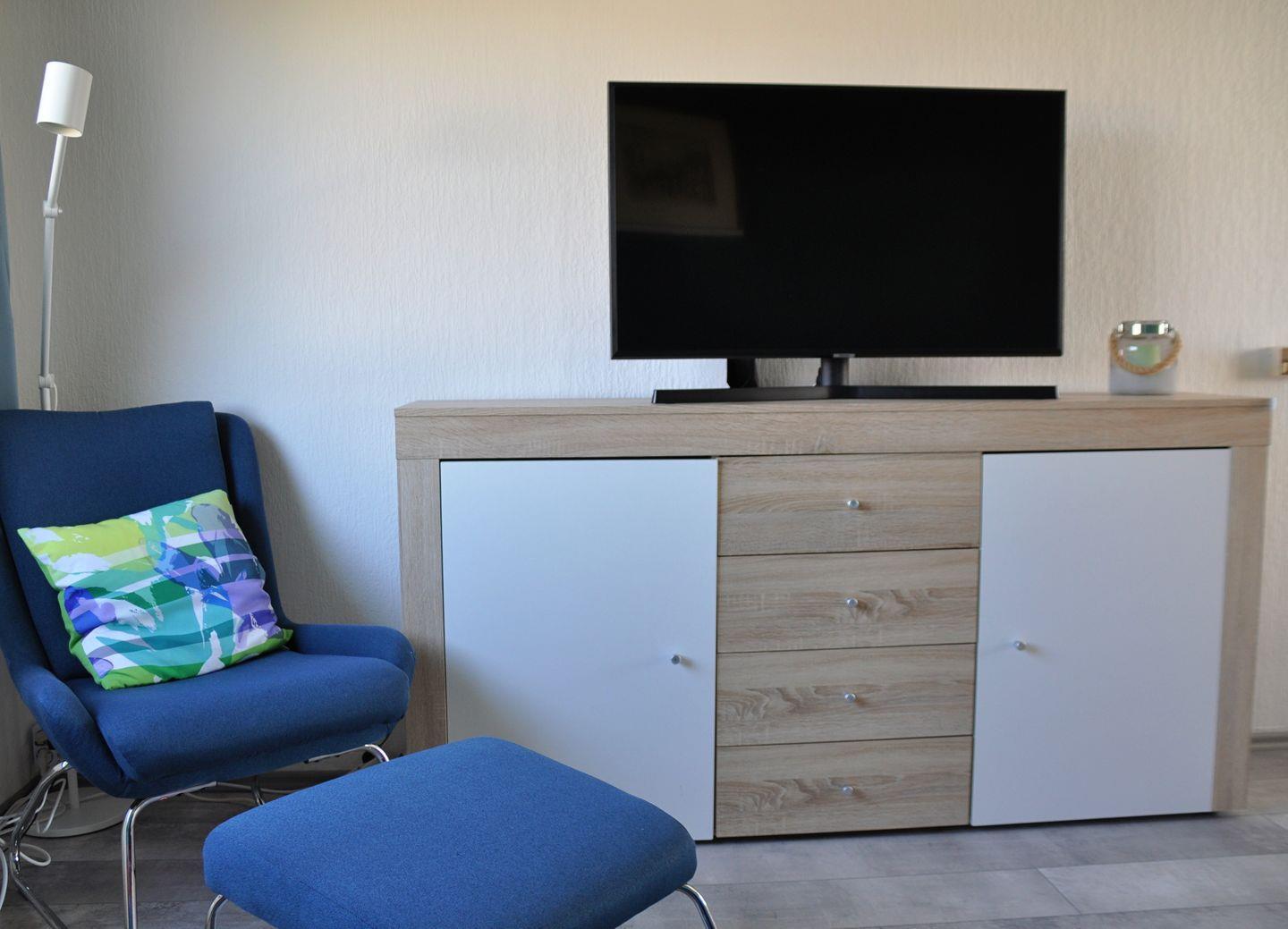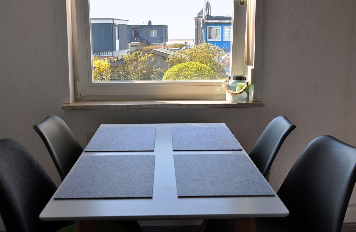 Über die Außentreppe erreichen Sie das lichtdurchflutete Obergeschoss, in dem sich ein stilvoll eingerichtetes Schlafzimmer mit Doppelbett, ein offener Wohnbereich mit moderner Küche und Essplatz, ein großzügiges Wohnzimmer sowie ein elegantes Duschbad befinden. Hier trifft nordischer Charme auf modernes Wohngefühl.