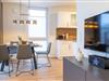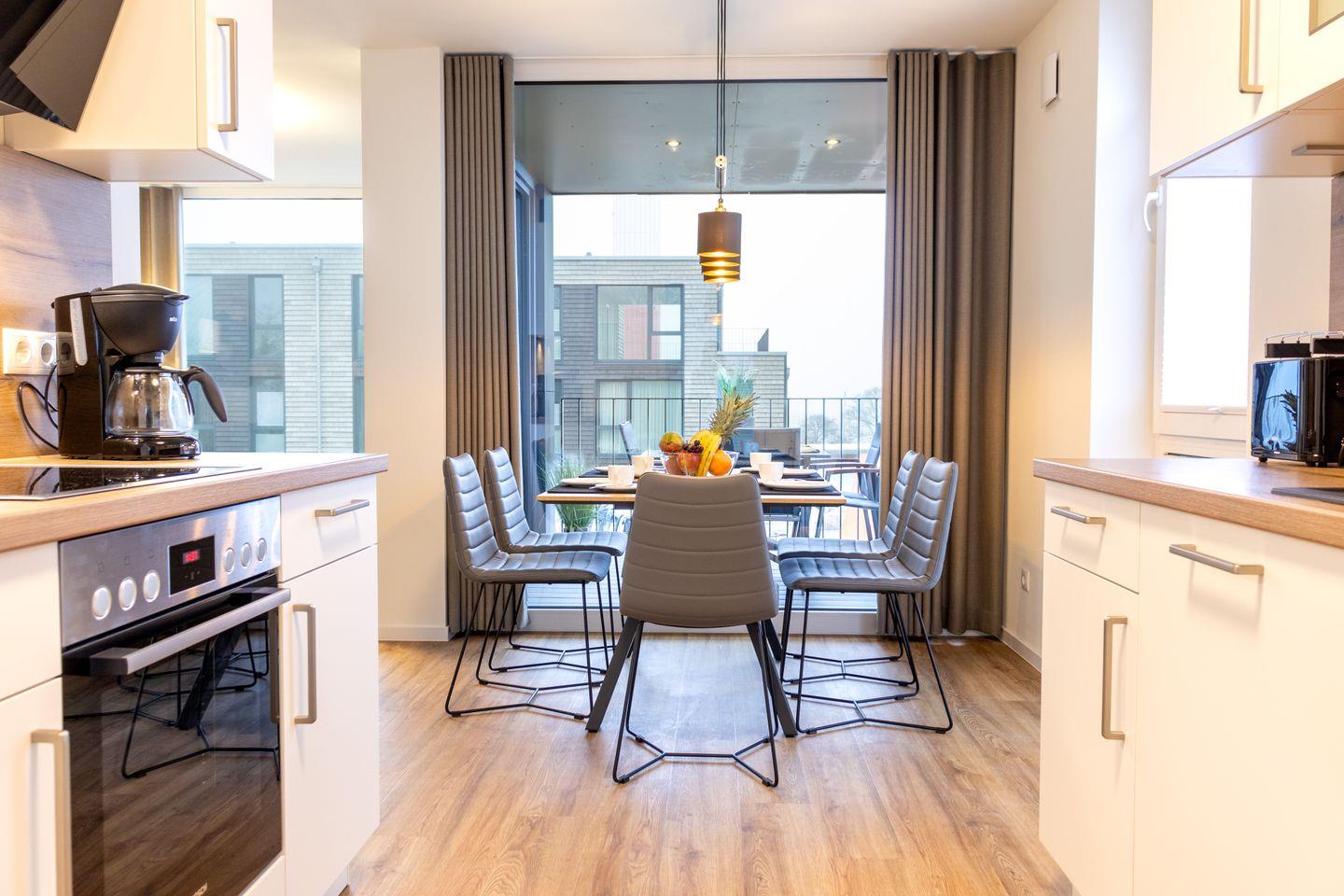 Im offenen Wohnbereich erwartet dich eine großzügige Sofalandschaft, bodentiefe Fenster und der direkte Zugang zur überdachten Loggia. Hier verschmelzen Licht, Meerblick und Gemütlichkeit zu deinem ganz persönlichen Wohlfühlort. Die moderne Küche mit hochwertigen Markengeräten lässt keine Wünsche offen – ob Geschirrspüler, Backofen oder Mikrowelle: Alles ist vorbereitet für dein gemeinsames Kocherlebnis. Waschmaschine und Trockner ergänzen die Ausstattung – und dank Aufzug erreichst du deine Wohnung ganz bequem.