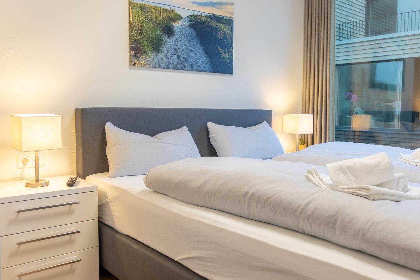 Zwei separate Schlafzimmer mit gemütlichen Boxspringbetten und jeweils einem eigenen Fernseher sorgen für angenehme Nächte und ruhige Rückzugsorte. Die großen Fenster bringen Licht und Luft in die Räume, Verdunkelungsmöglichkeiten sorgen für erholsamen Schlaf. Die Einrichtung ist stilvoll und harmonisch – perfekt zum Entspannen. Wenn du eigene Bettwäsche mitbringen möchtest, beachte bitte, dass alle Betten mit durchgehenden Matratzen ausgestattet sind.