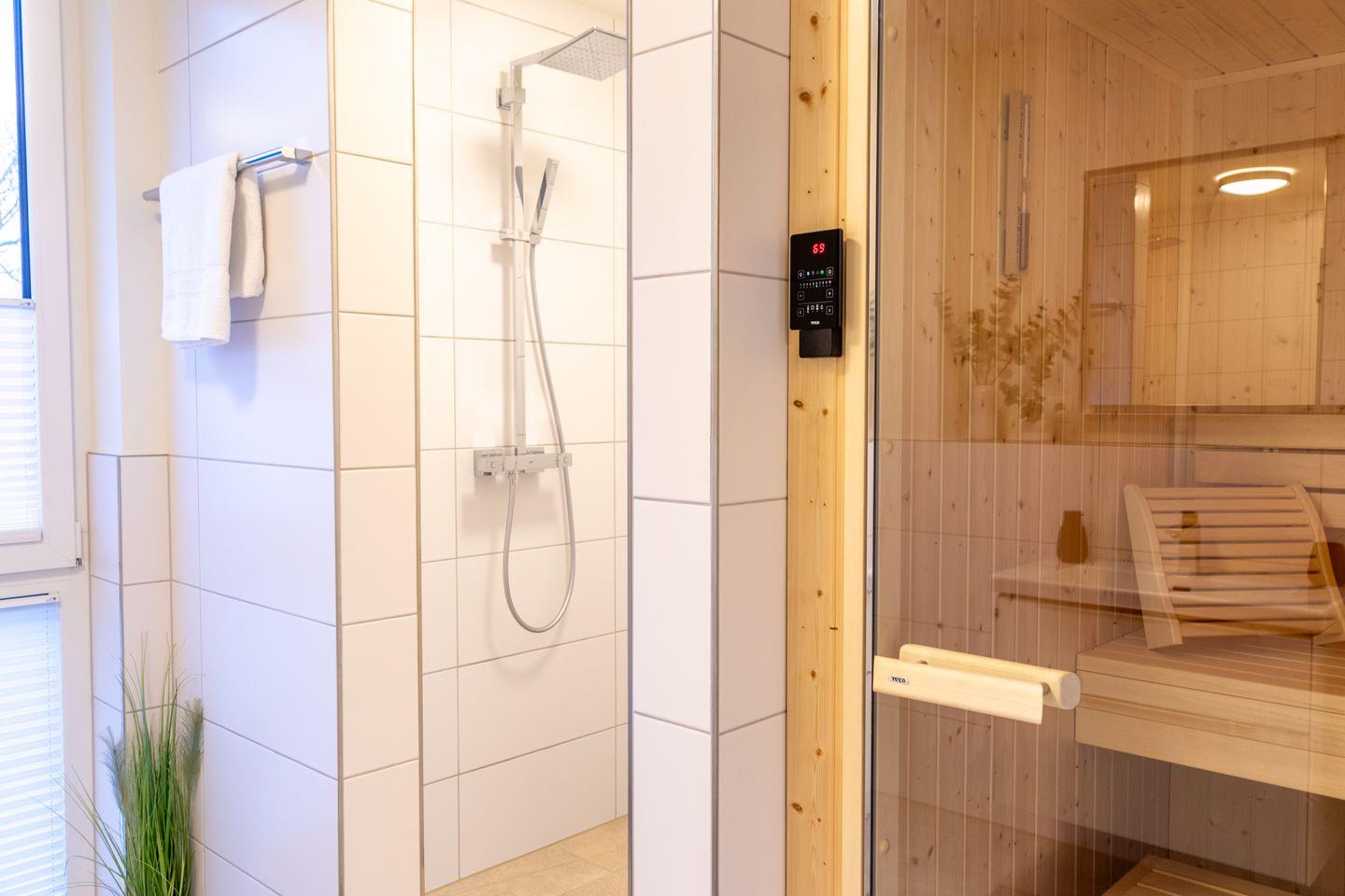 Dein privates Badezimmer ist deine ganz persönliche Wellnessoase. Die großzügige, ebenerdige Dusche, eine private Sauna und ein eleganter Spiegel mit Beleuchtung machen aus jedem Abend ein kleines Spa-Erlebnis. Genau der richtige Ort, um zur Ruhe zu kommen und neue Energie zu tanken.