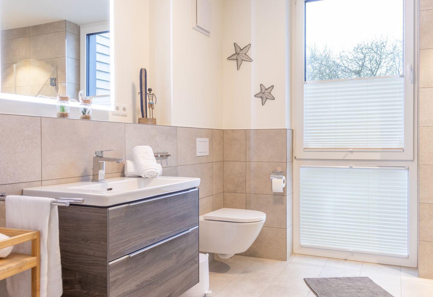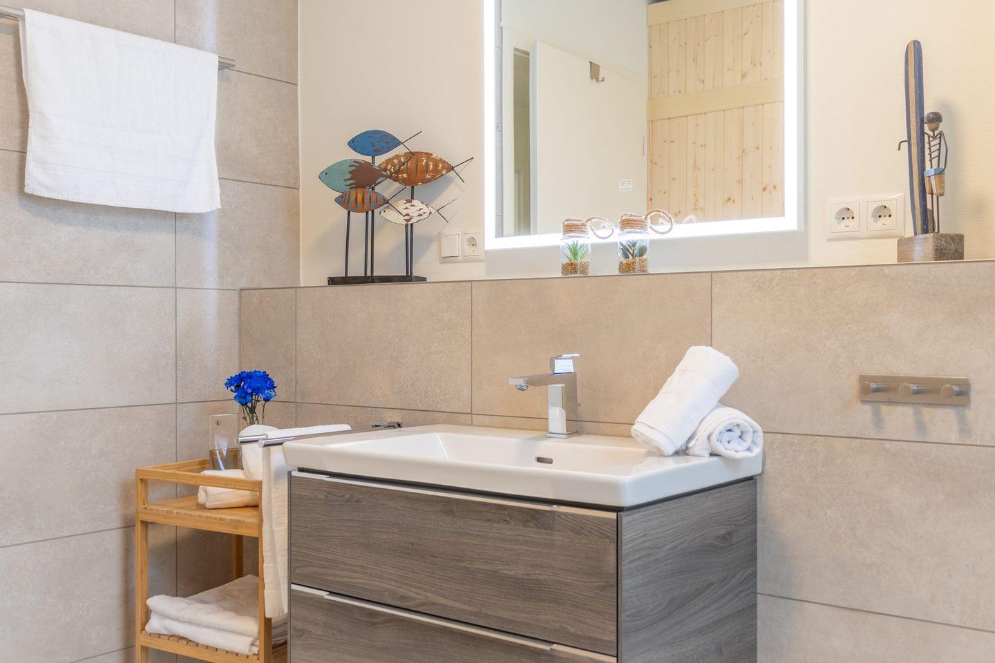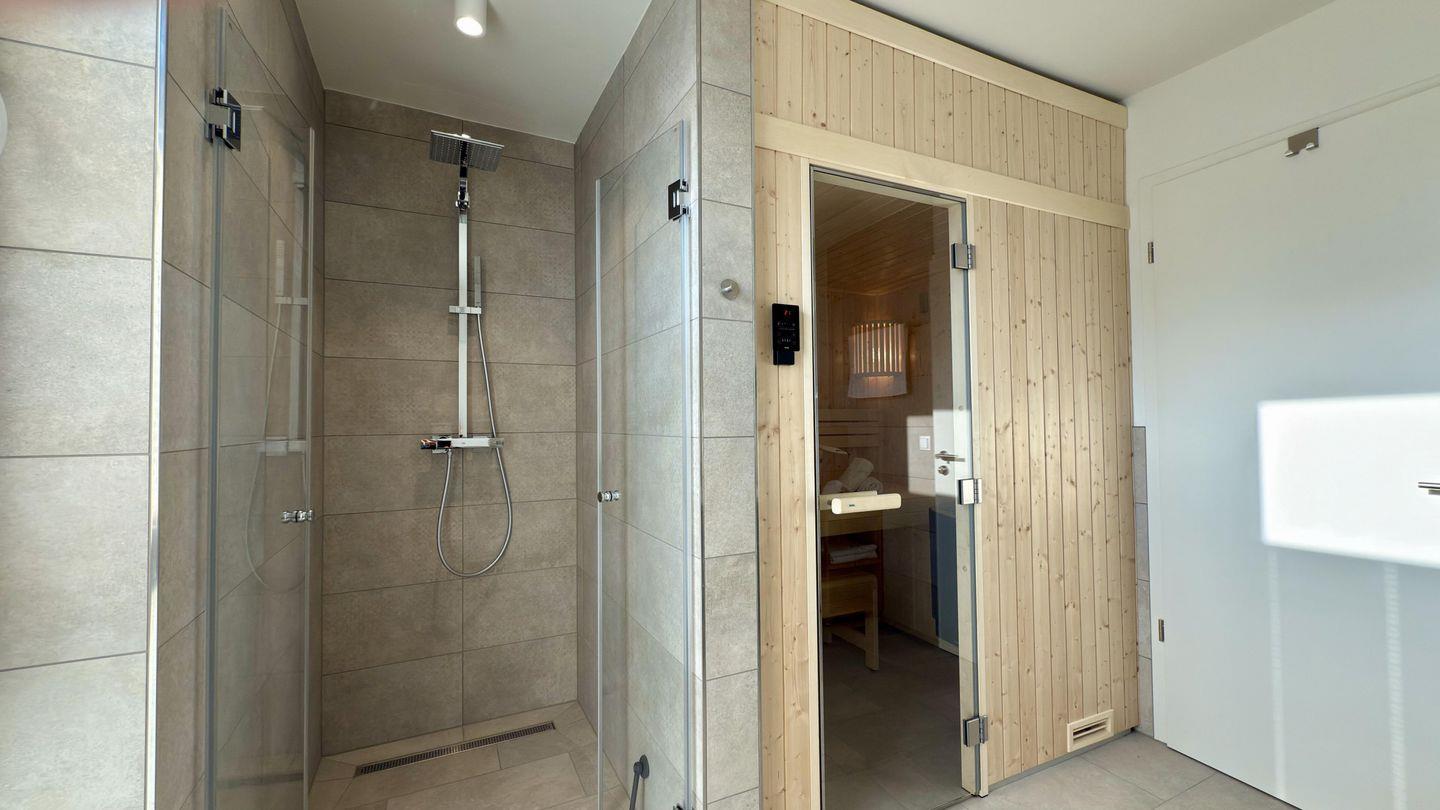 Deine persönliche Wellnesszone: Das moderne Bad bietet dir eine private Sauna und eine großzügige, ebenerdige Dusche. Nach einem Tag am Strand oder einer Fahrradtour kannst du hier entspannen, durchatmen und neue Energie tanken.