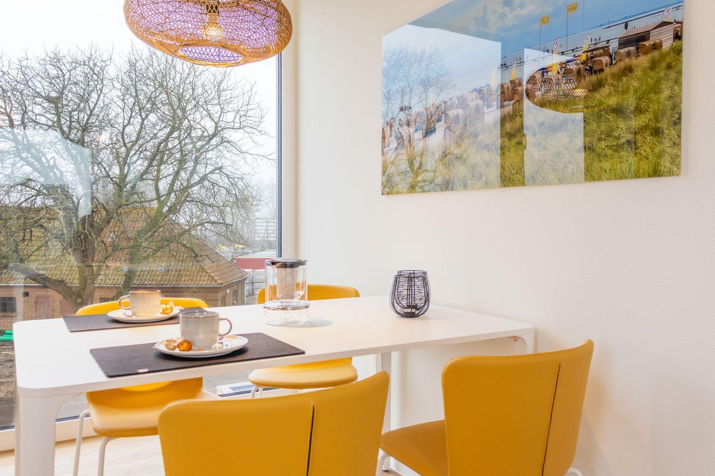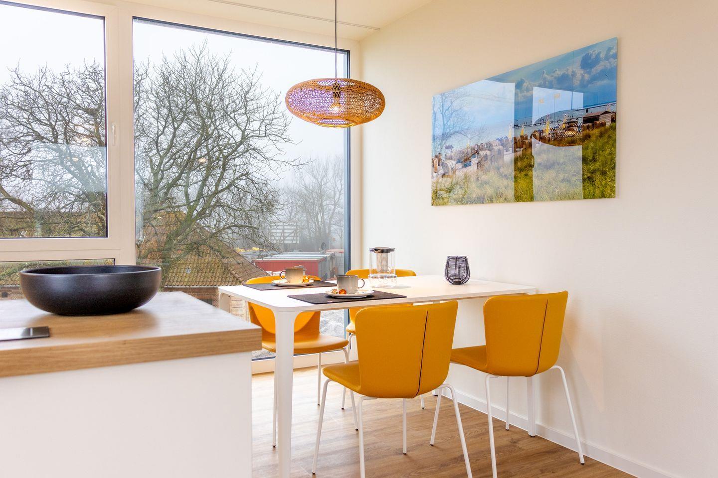 Der offene Wohnbereich ist in warmen Naturtönen gehalten und verbindet zeitgemäßes Design mit hochwertiger Ausstattung. Große Fenster lassen viel Licht herein und führen direkt auf die großzügige Dachterrasse. Die Küche ist vollständig ausgestattet – mit Geschirrspüler, Backofen, Cerankochfeld und Kaffeemaschine. Ob Frühstück in der Sonne oder ein Abendessen mit Meerblick – hier lässt es sich rundum wohlfühlen.