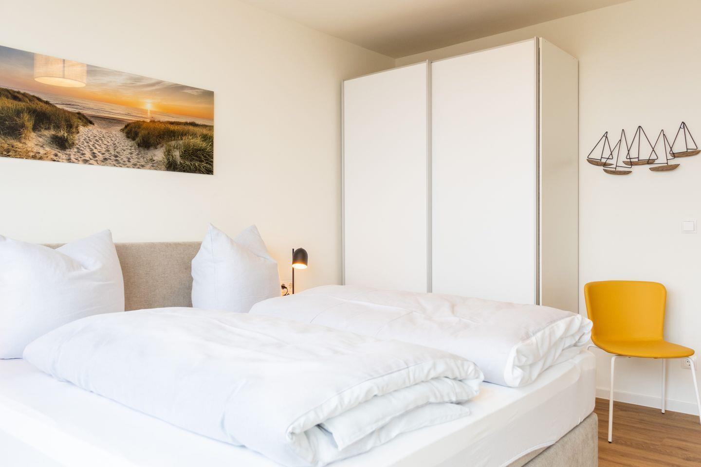 Das Schlafzimmer bietet mit seinem bequemen Boxspringbett, bodentiefen Fenstern und Verdunkelungsmöglichkeiten den idealen Ort für erholsame Nächte. Harmonische Farben und durchdachte Einrichtung sorgen für Gemütlichkeit. Im Wohnbereich steht dir bei Bedarf ein Schlafsofa für zwei Kinder zur Verfügung – ideal für Familien mit Nachwuchs. Alle Betten sind mit durchgehenden Matratzen ausgestattet.