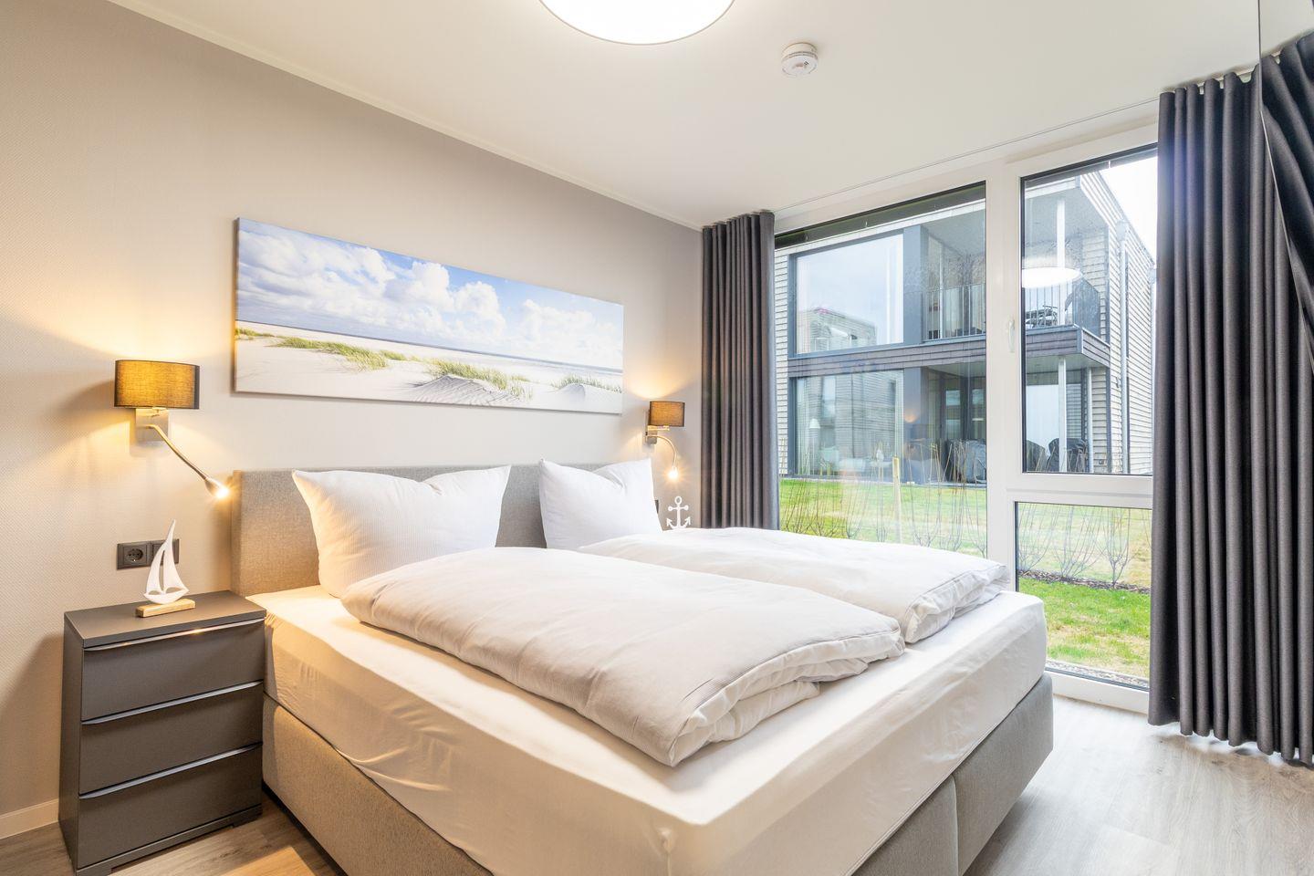 In zwei separaten Schlafzimmern findest du bequeme Boxspringbetten und jeweils einen Smart-TV für entspannte Abende im Bett. Eines der Schlafzimmer bietet sogar direkten Meerblick. Für weitere Gäste stehen zwei zusätzliche Schlafplätze auf dem hochwertigen Schlafsofa im Wohnzimmer bereit (Aufpreis). Alle Betten verfügen über durchgehende Matratzen – ideal, wenn du deine eigene Bettwäsche mitbringen möchtest.