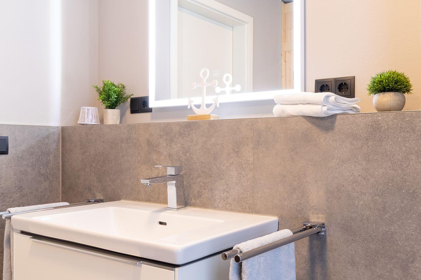 Dein privates Wellnessbad ist mit einer großzügigen, bodengleichen Dusche und einer Sauna ausgestattet. Ein beleuchteter Spiegel, hochwertige Materialien und viel Platz schaffen eine luxuriöse Wohlfühlatmosphäre – perfekt, um den Tag entspannt ausklingen zu lassen.