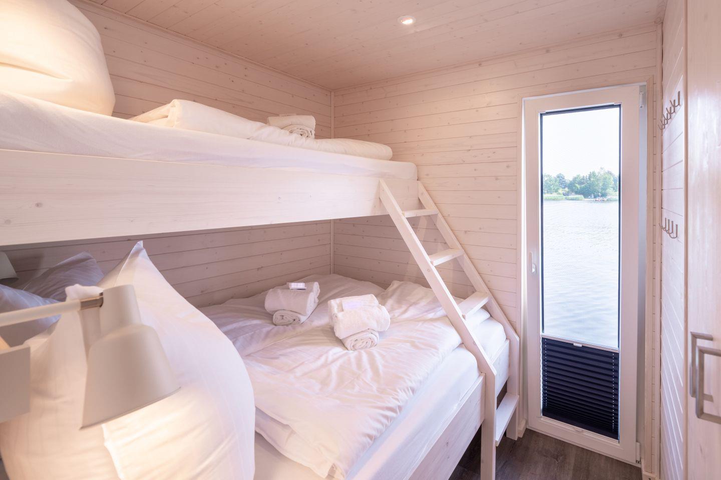 Die „Schatzkiste“ bietet Ihnen auf rund 32 m² liebevoll gestalteten Raum für einen erholsamen Urlaub auf dem Wasser. Der offene Wohnbereich mit voll ausgestatteter Küche lädt zum Entspannen, gemeinsamen Kochen und Genießen ein. Zwei separate Schlafzimmer – eines mit Doppelbett, eines mit Etagenbett für drei Personen – sowie getrennte Dusche und WC sorgen für Komfort und Privatsphäre. Auf zwei Terrassen, eine davon überdacht, können Sie Sonne, Wind und Wasser in vollen Zügen genießen. WLAN, Smart-TV und Bluetooth-Radio stehen für Unterhaltung bereit. Nachhaltig ausgestattet mit Biokläranlage und umweltfreundlichem Starterpaket ist die „Schatzkiste“ der ideale Ausgangspunkt, um Fehmarn zu entdecken – nur wenige Schritte vom Strand mit Blick auf die Fehmarnsundbrücke entfernt.