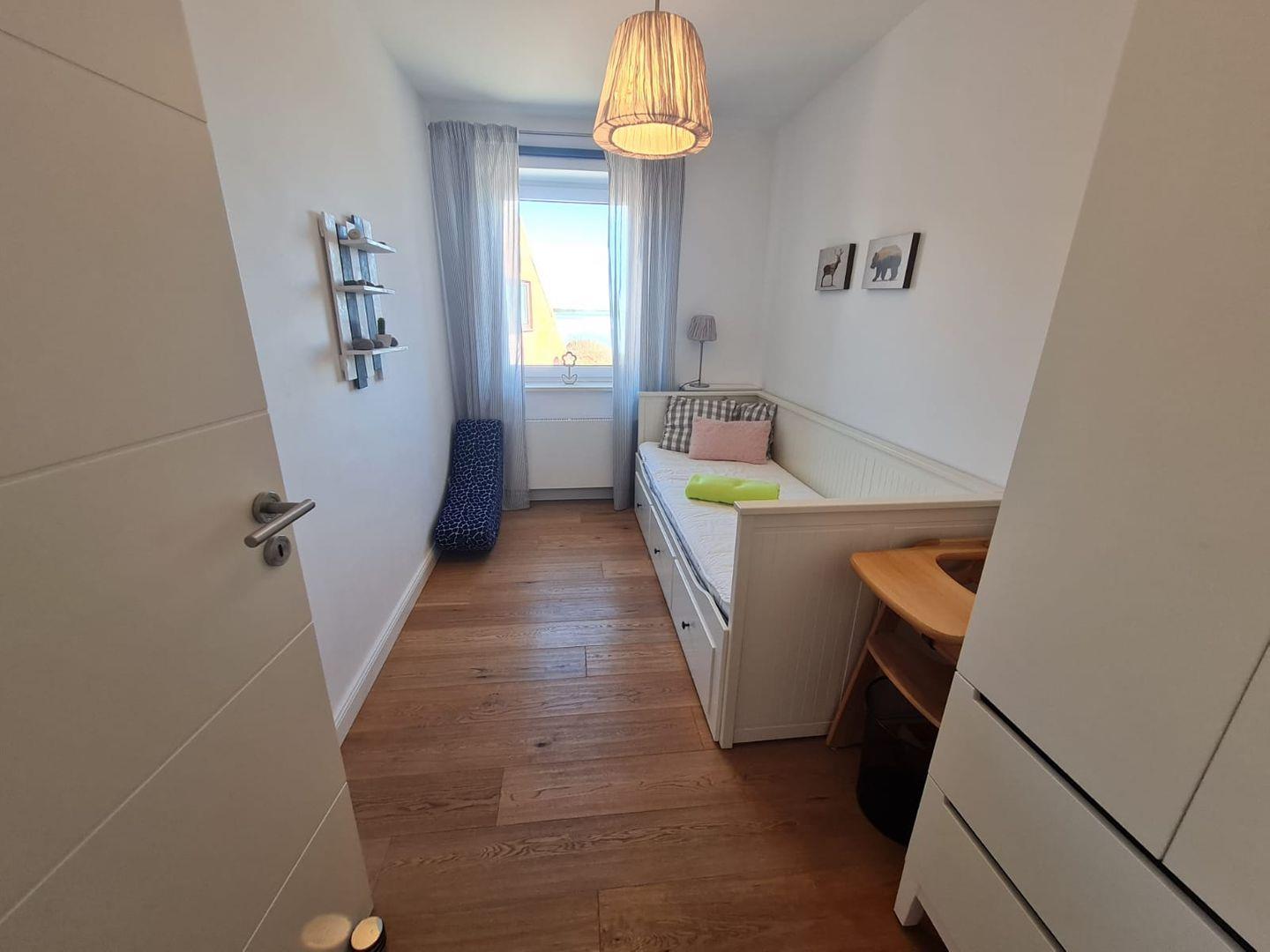 Das Elternschlafzimmer mit Doppelbett, 180x200 cm groß ist mit einem zusätzlichem Fernseher ausgestattet. Das Kinderzimmer hat ein ausziehbares Bett mit der Größe von 160x200 cm. Das geräumige Vollbad hat eine Waschmaschine und einen Fön.