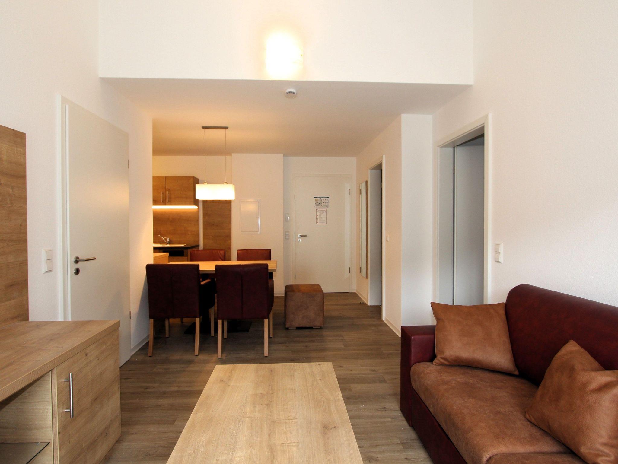 3-Zimmer-Appartement für 4-6 Personen, 2 Schlafzimmer mit Doppelbetten, Wohn-Schlafraum mit Doppelbettcouch, separater Essplatz, voll ausgestatteter Küchenbereich, Geschirrspüler, Bad mit Dusche/WC, Balkon, SAT-TV.