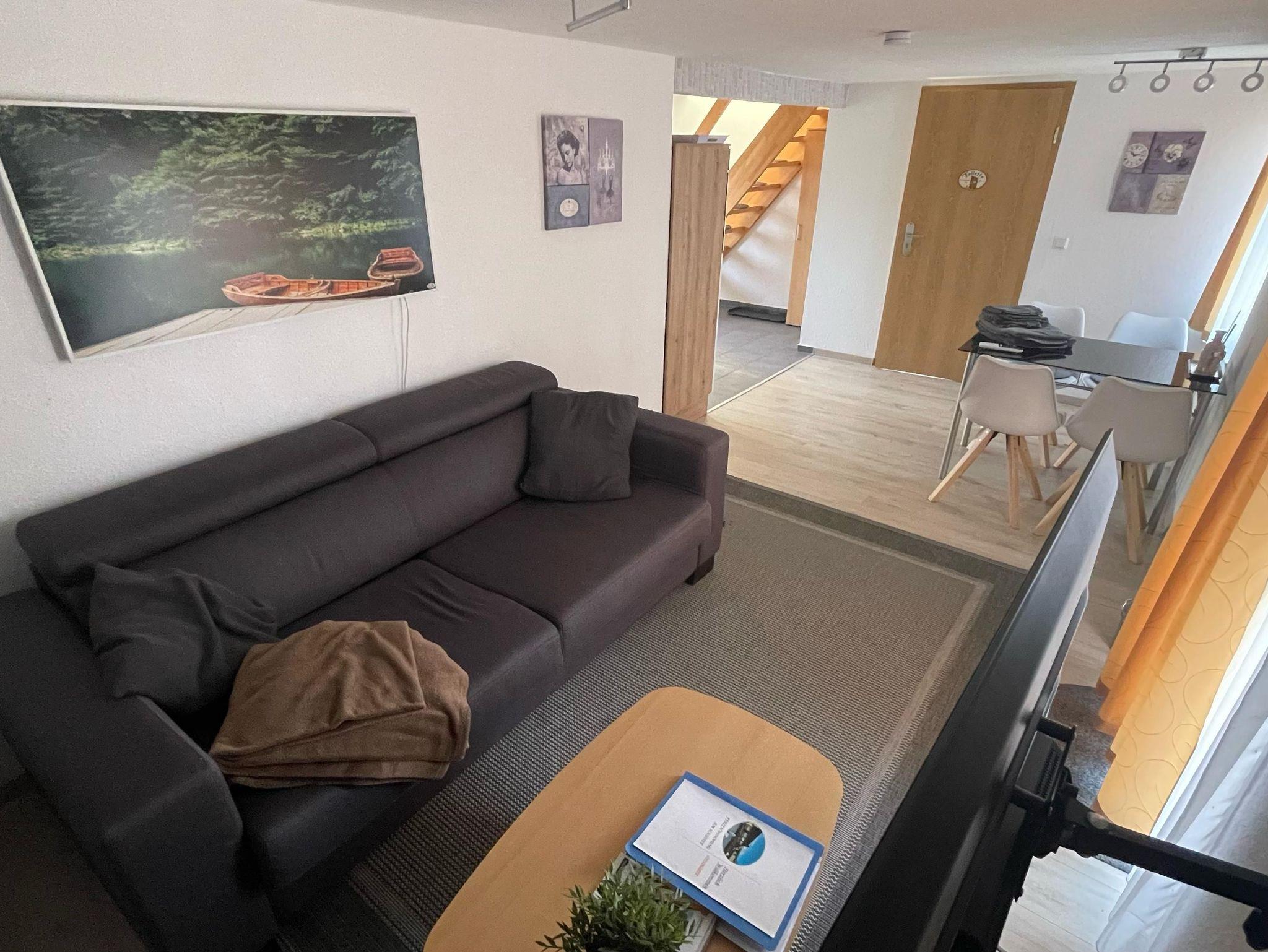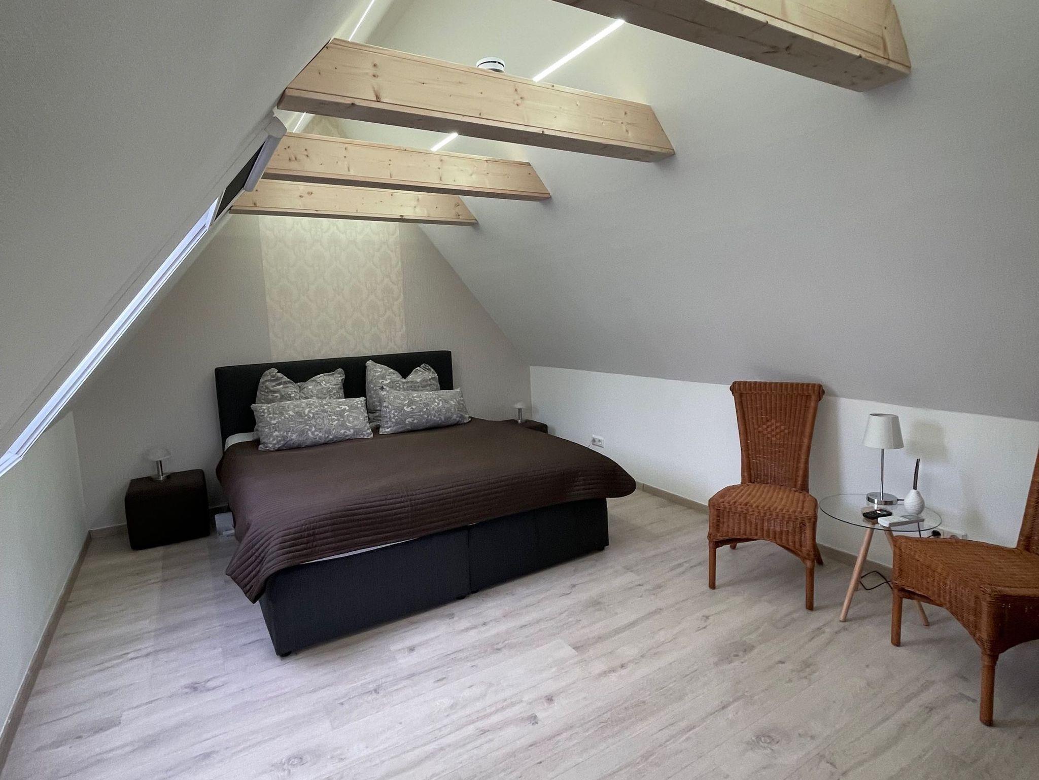 Die Ferienwohnung (Mansardenwohnung) bietet mit seiner Wohnküche und der dazu gehörenden Terrasse einen schönen Blick auf den See. Das im Dachgeschoss gelegene Schlafzimmer ist mit einem Boxspringbett und einem Einzelbett ausgestattet. Im Wohnzimmer befindet sich für weitere Schlafmöglichkeiten ein Schlafsofa.