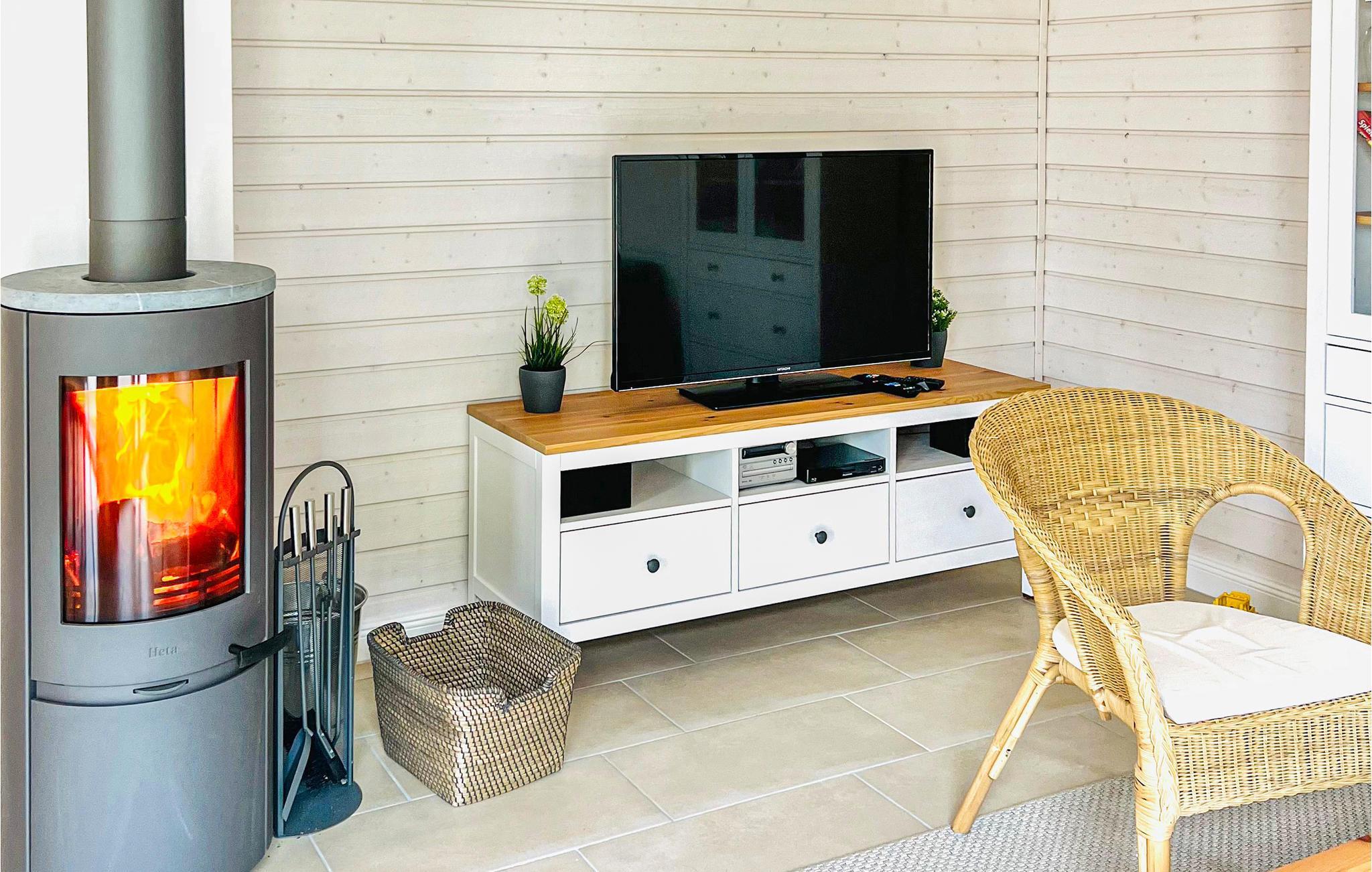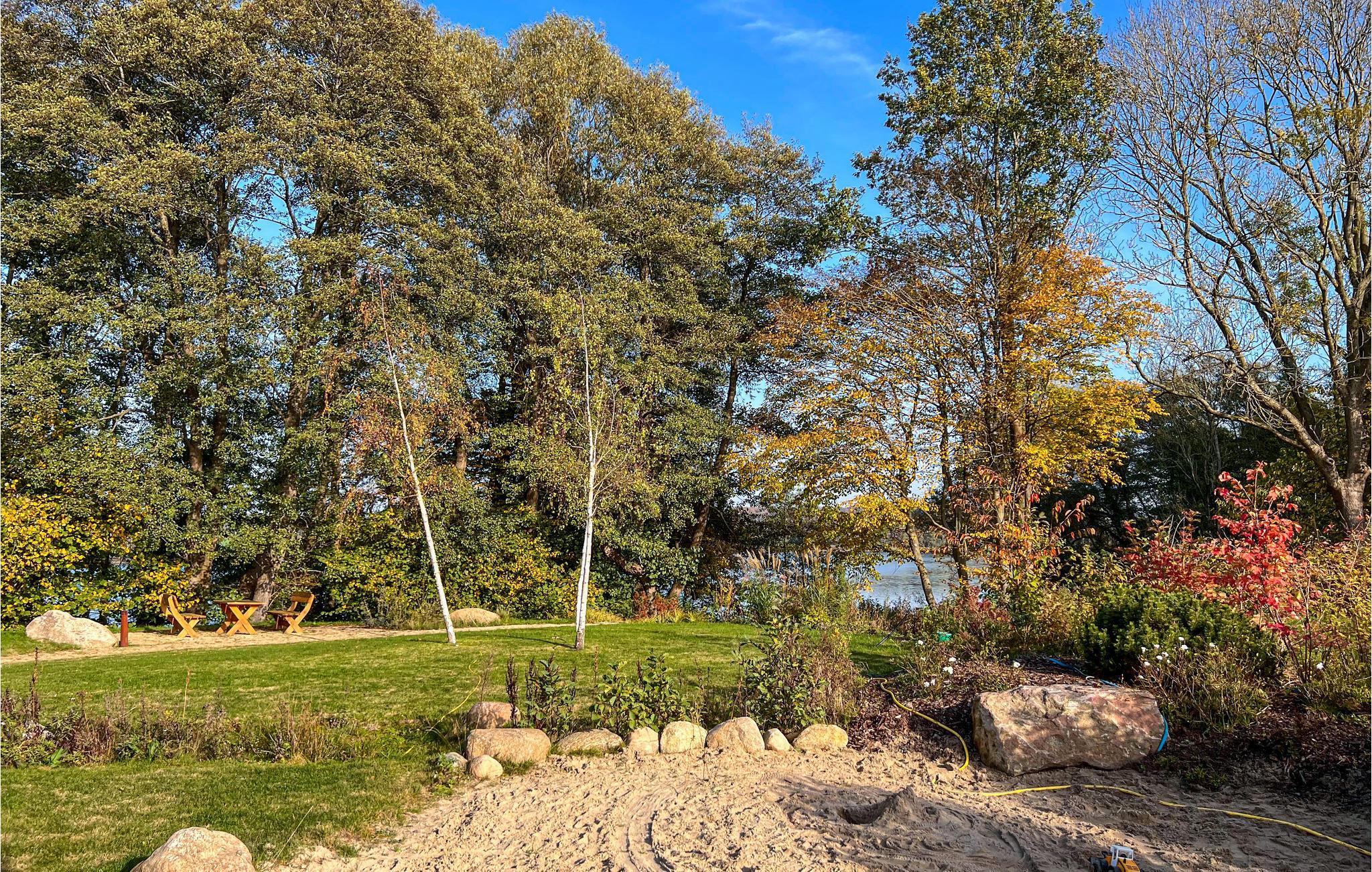 Modernes Ferienhaus am Wardersee mit Sauna, Kamin und direktem Seezugang für erholsame Familienferien.