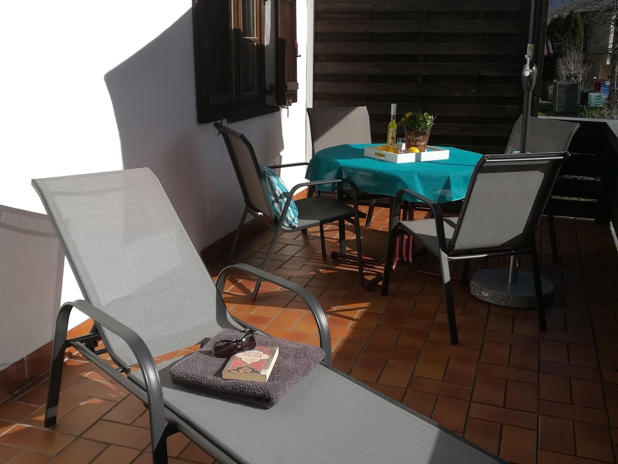 Die Ferienwohnung verfügt über einen direkten Zugang zur eigenen Terrasse, mit Tisch, Stühlen, Liegen und Sonnenschirm.