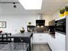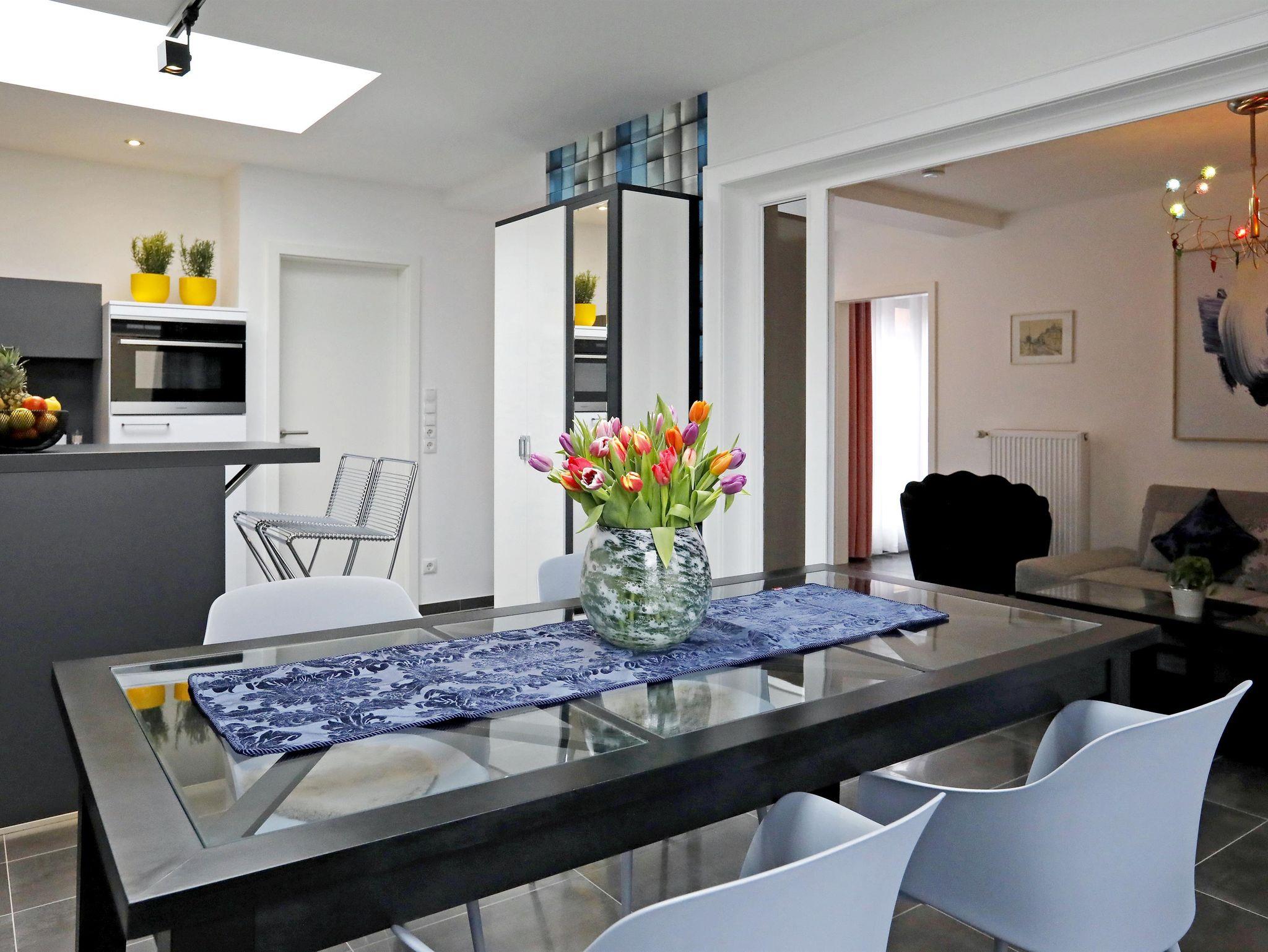Wir gelangen in eine geräumige offene Küche mit integriertem Essbereich. Die Besonderheit hier sind zwei große Flachdach-Fenster. Sie tauchen den Raum in ein helles Tageslicht. Ein großer Tisch mit komfortablen Stühlen nebst zwei Designer-Hockern an der Theke bieten Platz zum Verweilen. Die modernen Küchenschränke sind mit allen Utensilien ausgestattet. Neben einem Geschirrspüler, einer Waschmaschine inkl. Trockner, einem Backofen mit integrierter Mikrowelle finden Sie einen Kühlschrank mit Gefrierfach, einen Nespresso-Automat, Toaster, Wasserkocher etc.