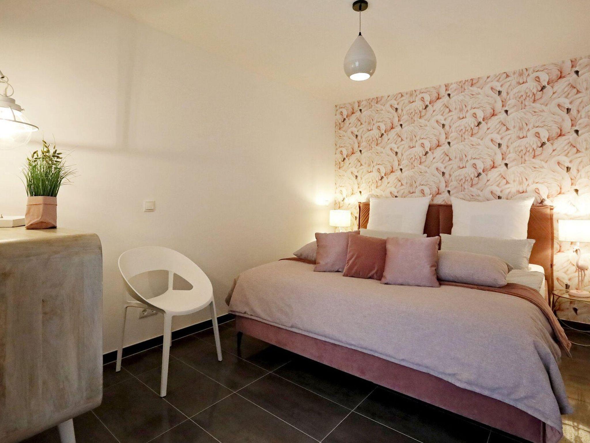 Das gemütliche Schlafzimmer verfügt über ein schickes Doppel-Boxspringbett. Zwei Kissen, Sommer-/Winter-Decke (pro Person) mit duftender Bettwäsche stehen Ihnen zur Verfügung. Ein großer moderner Schrank mit ausreichend Bügeln wartet auf Füllung.