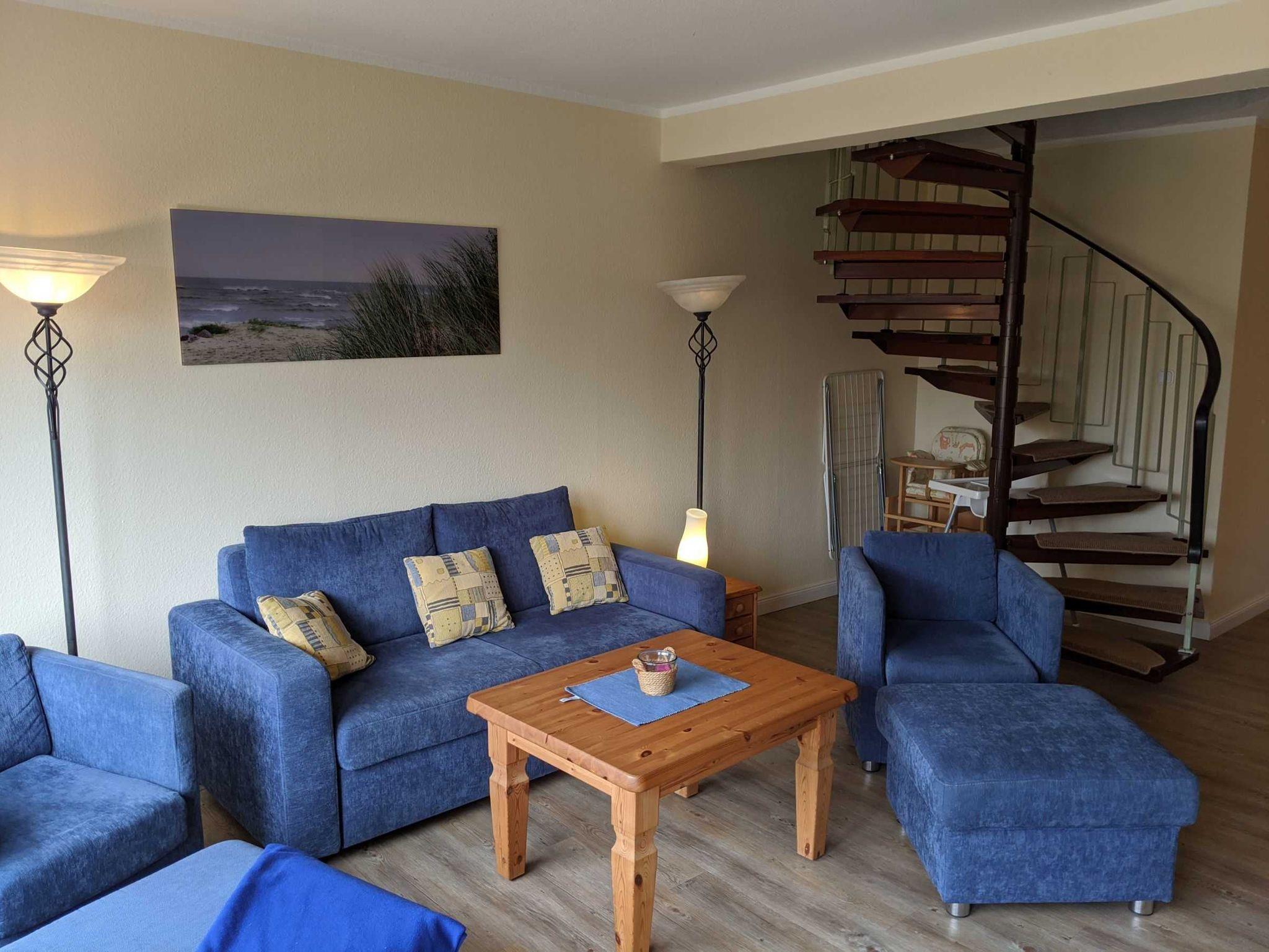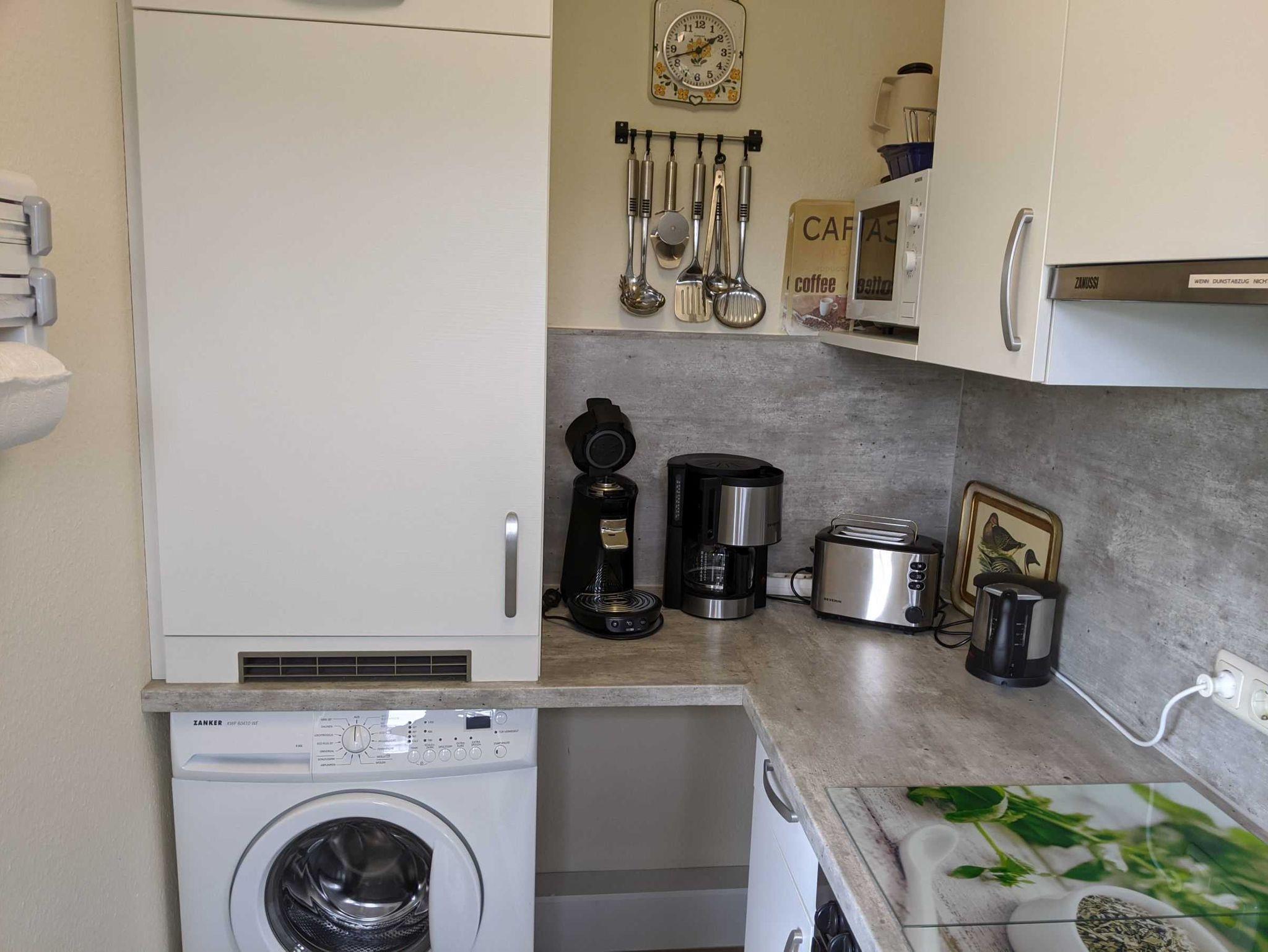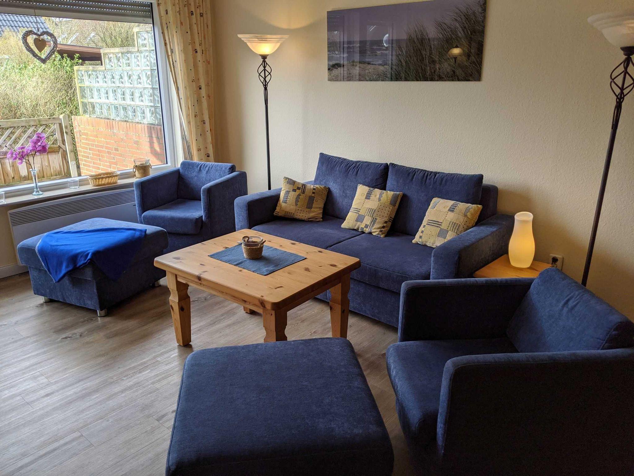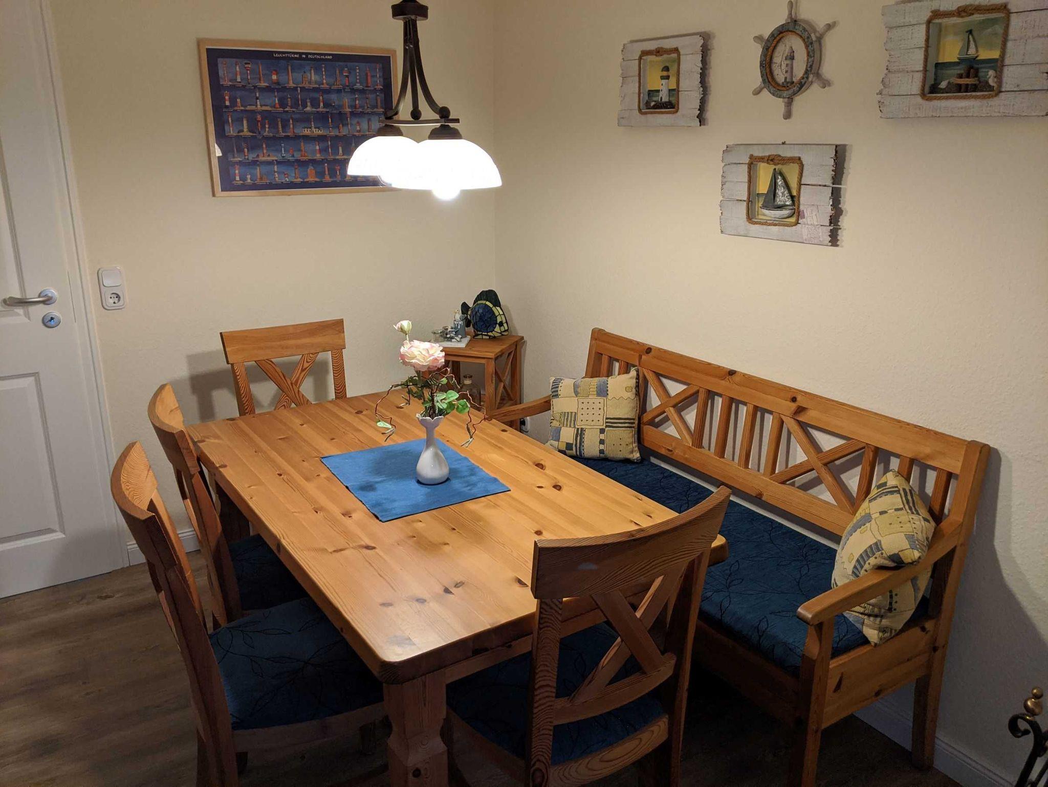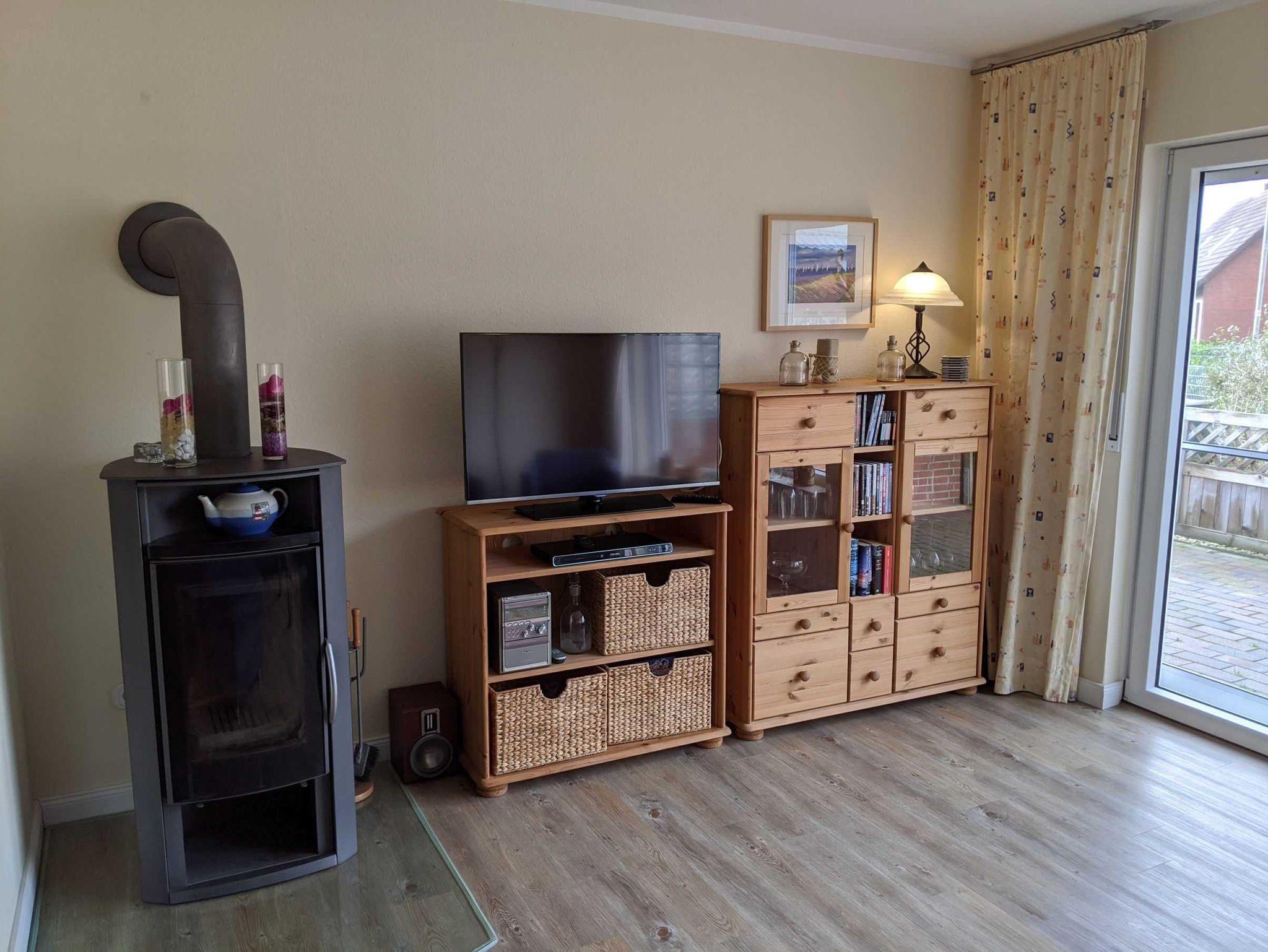 Das Wohnzimmer ist mit einer Couchgarnitur, einem Kaminofen, SAT-TV und HD+, DVD-Spieler, Stereoanlage und WLAN ausgestattet. Direkt angrenzend findet sich dort eine gemütliche Essecke. Eine separate, neue Einbauküche ist komplett ausgestattet mit Ceran-Kochfeld, Backofen, Kühlschrank, Geschirrspüler, Mikrowelle, Kaffeemaschine, Wasserkocher, Toaster, Waschmaschine und Senseo-Kaffeepad-Maschine. Ebenso finden Sie hier alles an Geschirr und Pütt un Pann.