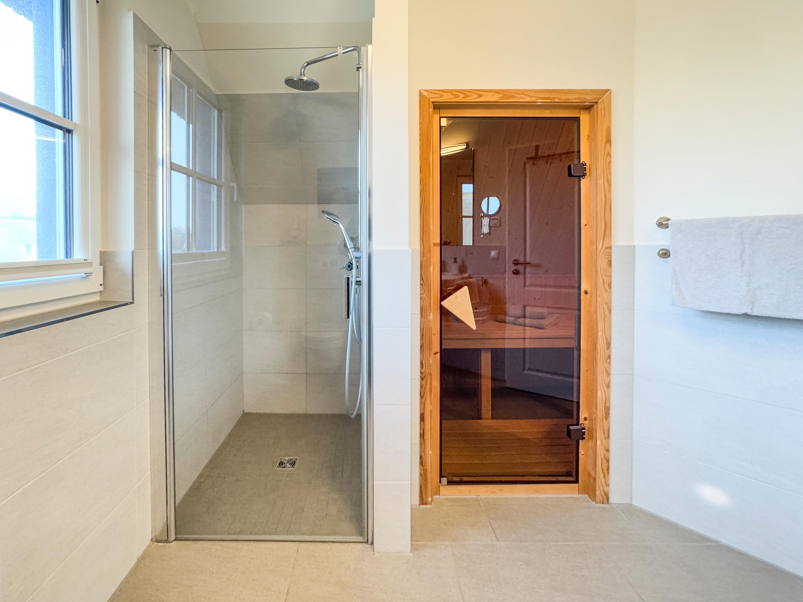 Nach einem erlebnisreichen Tag in der Natur bietet die private Sauna im Obergeschoss pure Entspannung. Zwei moderne Badezimmer mit bodentiefer Dusche, Fußbodenheizung und hochwertigen Details runden das Wellness-Erlebnis ab.