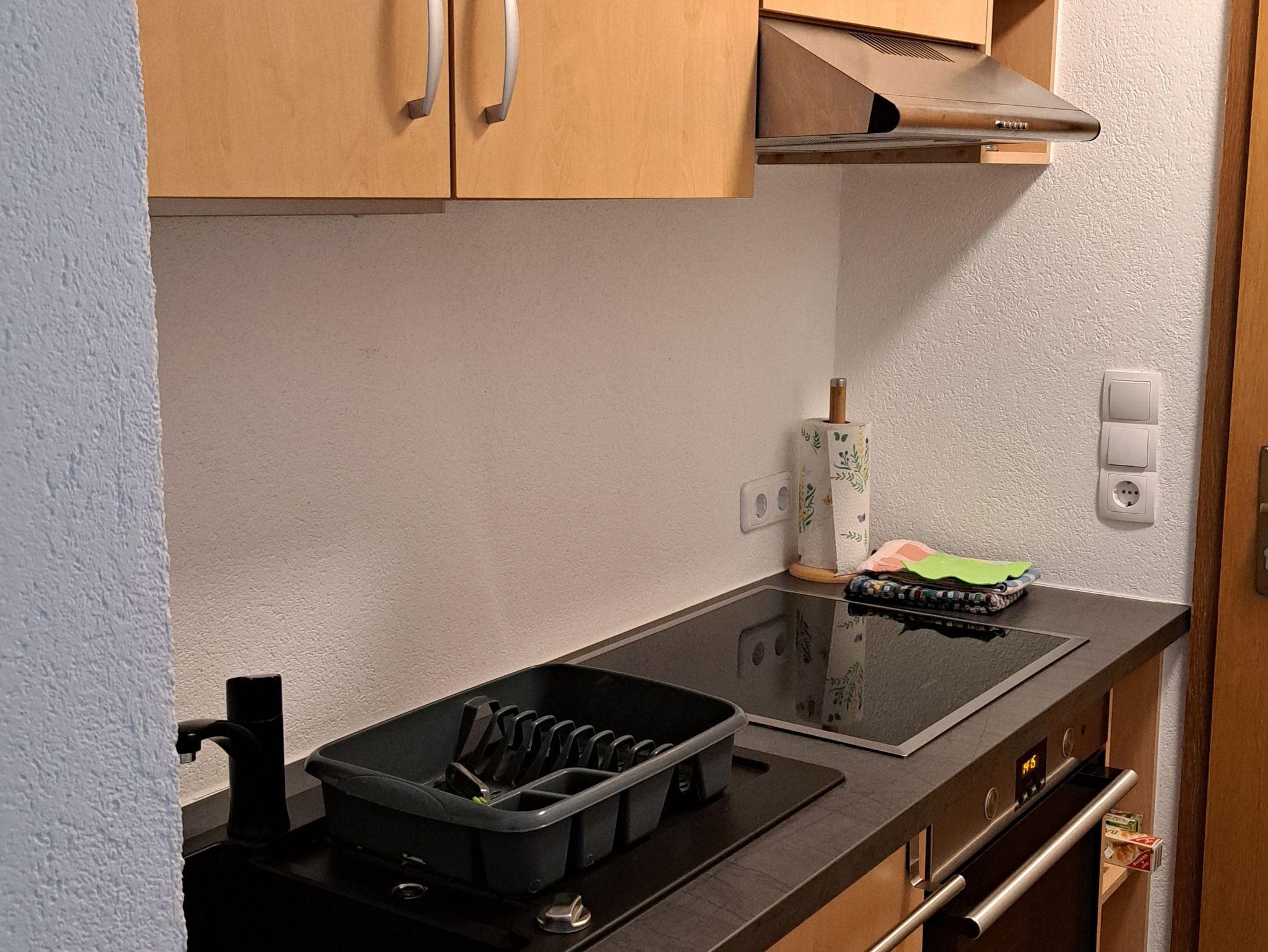In der vorhandenen Einbauküche (Ceranfeld mit 4 Kochfeldern, Backofen, Spüle, Kühlschrank) können Sie sich nach Herzenslust etwas kochen. Eine Grundausstattung an Gewürzen, Ewig, Öl, Kaffee, Tee ….. ist schon vorhanden.