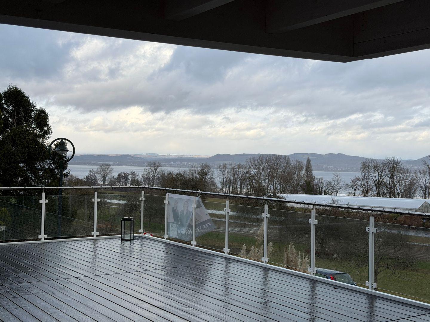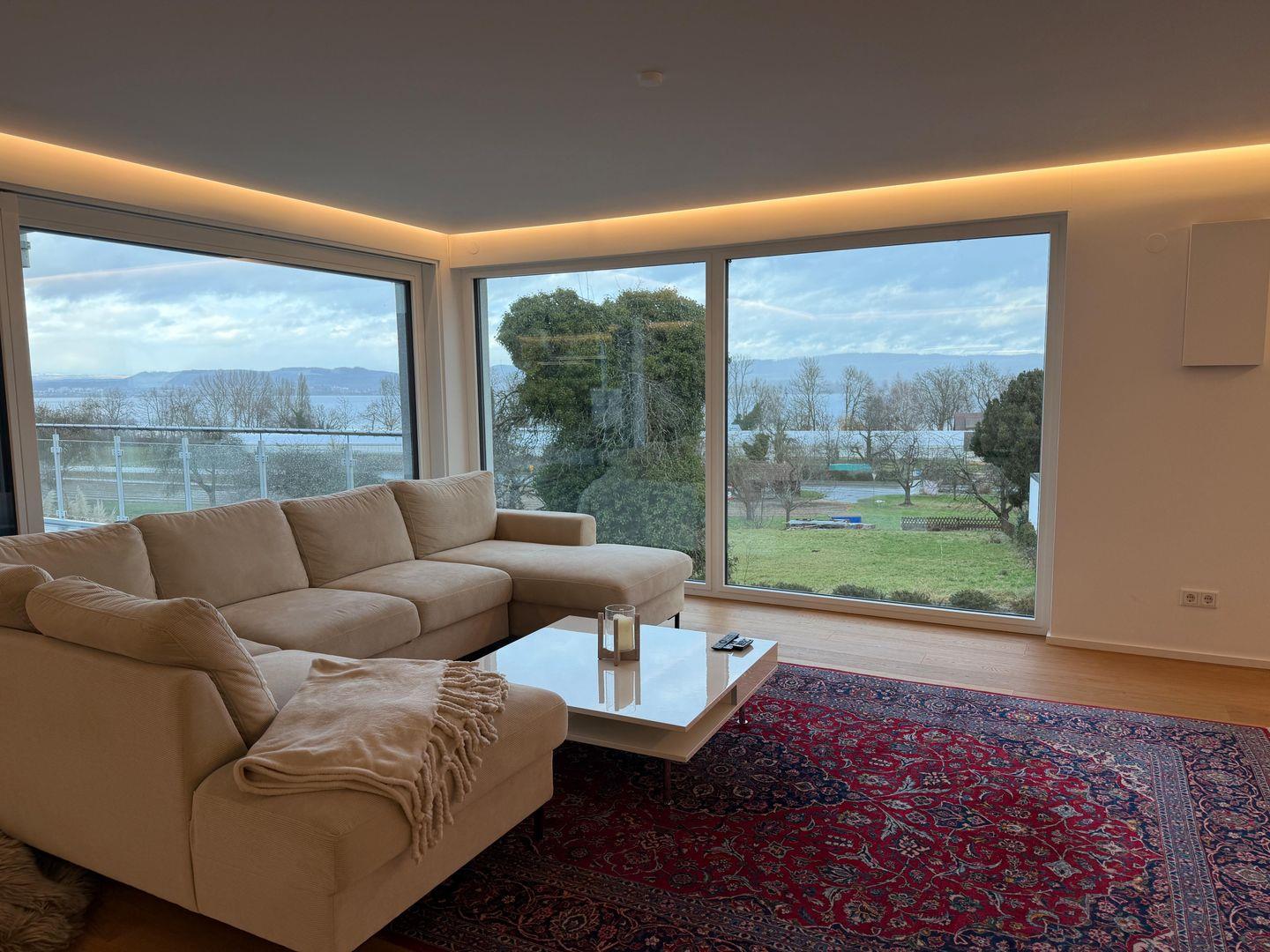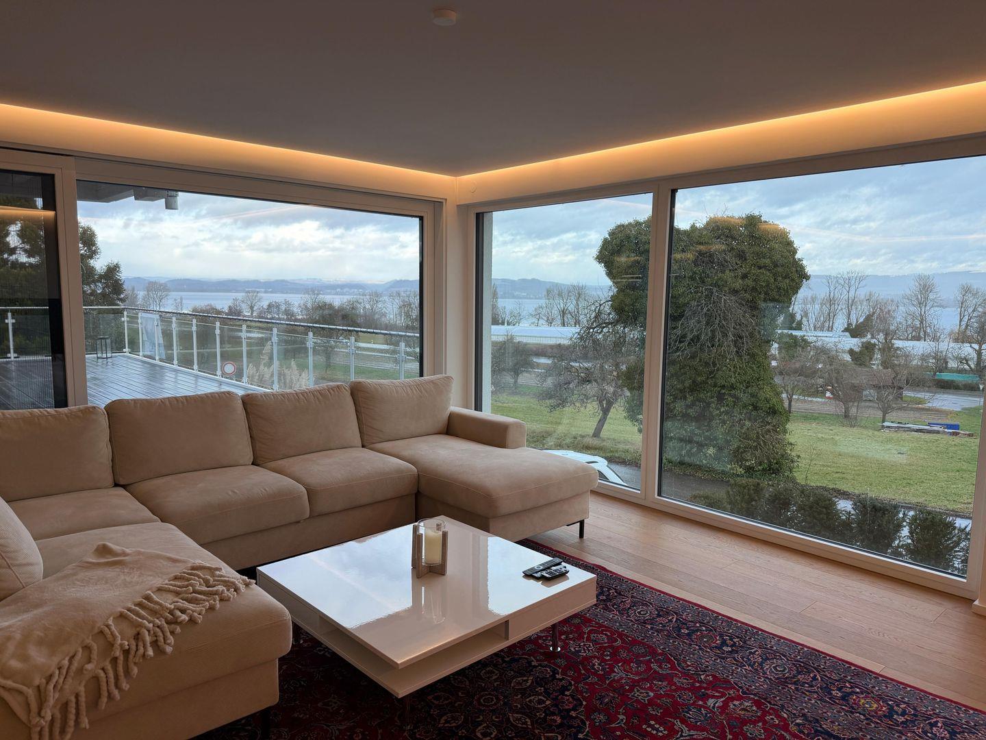 Seesehnsucht Höri – großzügige 185 m² Luxus-Ferienwohnung im 1. Obergeschoss mit Aufzug, 4 Zimmern und 3 Schlafzimmern für bis zu 8 Personen. Offener Wohnbereich mit Kaminofen, moderner Küche und großem TV. Zwei stilvolle Bäder mit bodengleichen Duschen sowie Whirlpool-Badewanne im Innenbereich. Riesige Terrasse mit wunderschönem Seeblick. Nur ca. 700 m zum See. Haustierfreundlich.