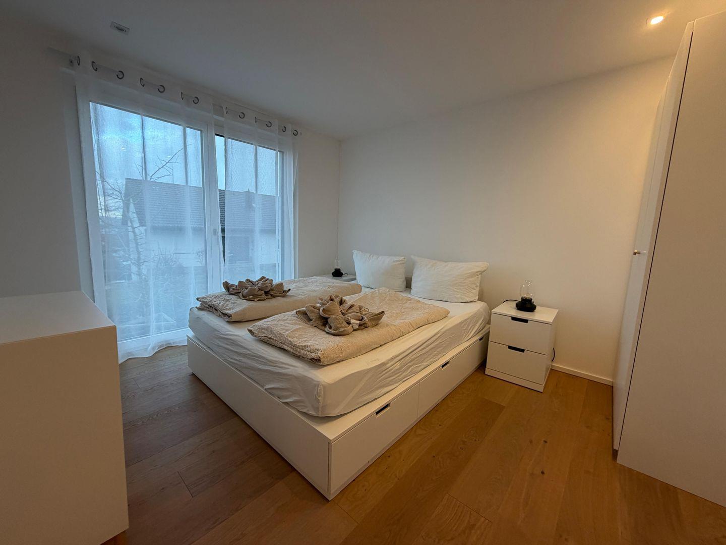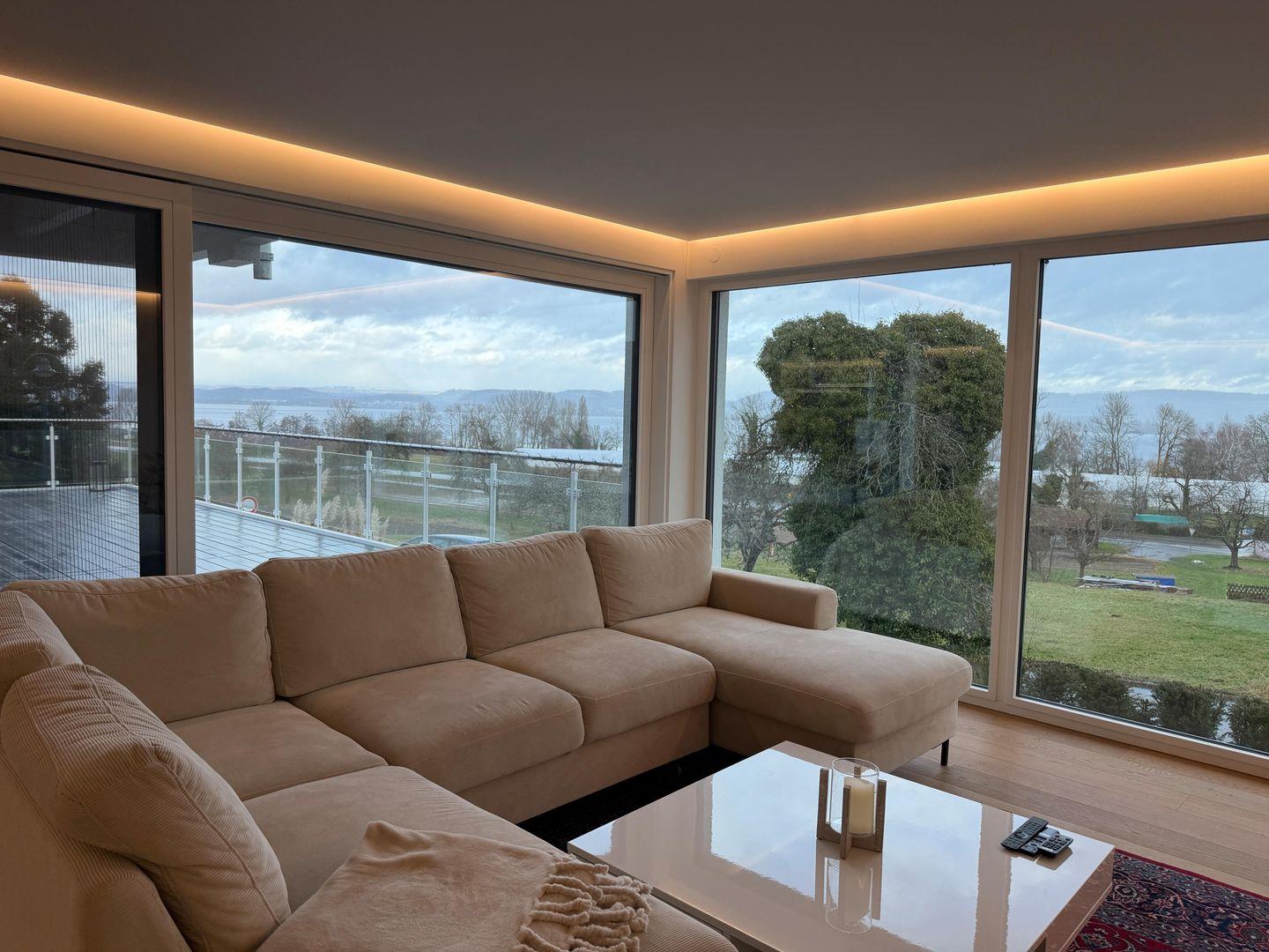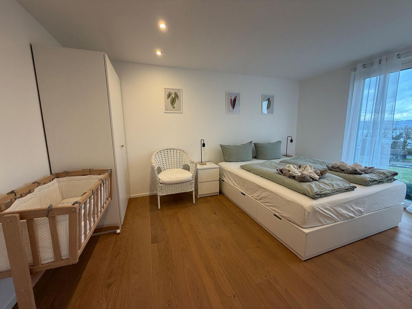 Seesehnsucht Höri – großzügige 185 m² Luxus-Ferienwohnung im 1. Obergeschoss mit Aufzug, 4 Zimmern und 3 Schlafzimmern für bis zu 8 Personen. Offener Wohnbereich mit Kaminofen, moderner Küche und großem TV. Zwei stilvolle Bäder mit bodengleichen Duschen sowie Whirlpool-Badewanne im Innenbereich. Riesige Terrasse mit wunderschönem Seeblick. Nur ca. 700 m zum See. Haustierfreundlich.