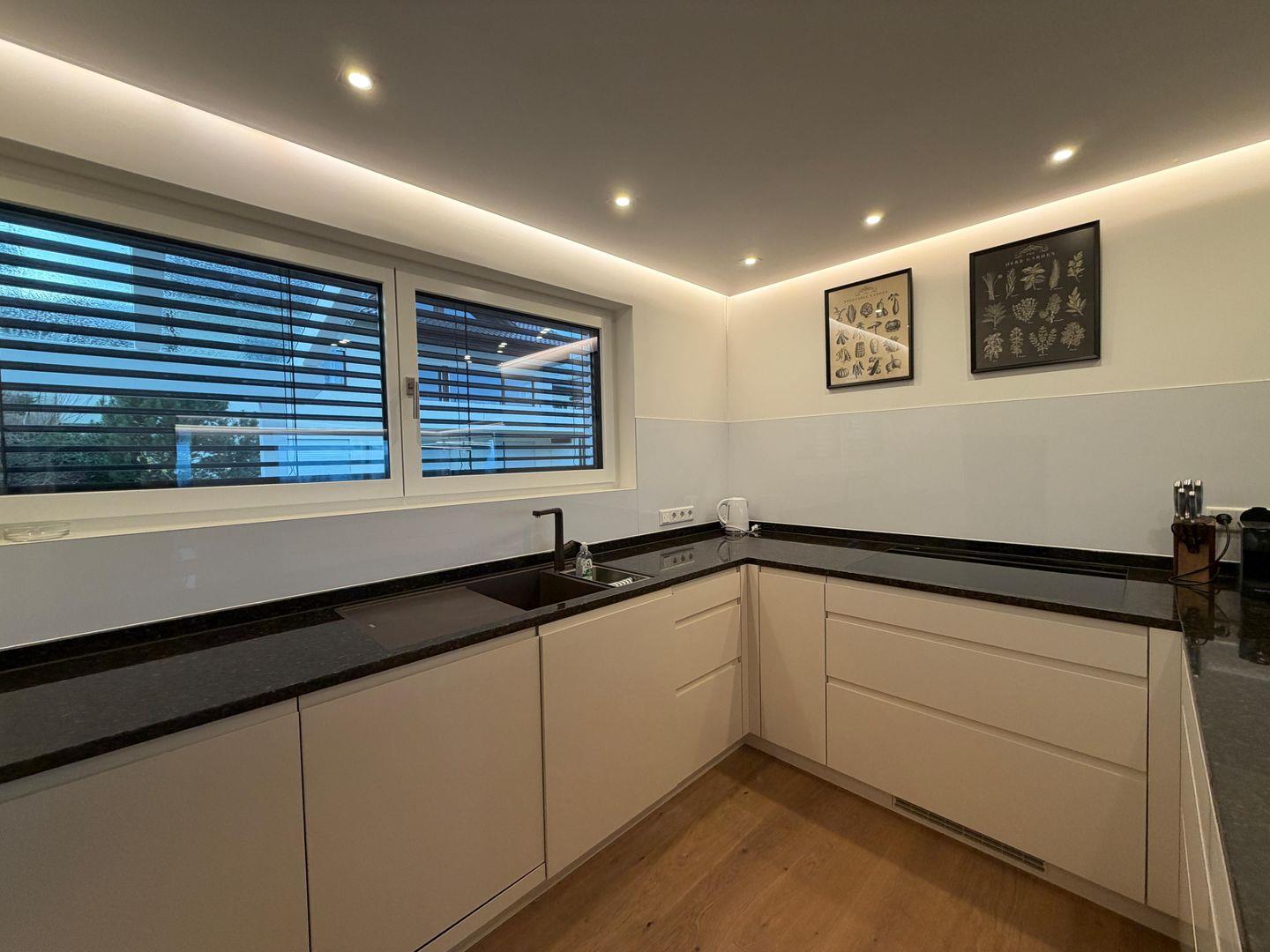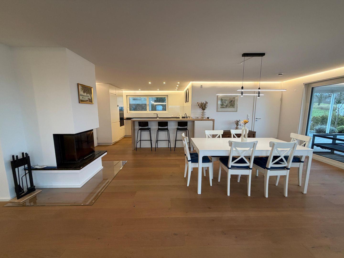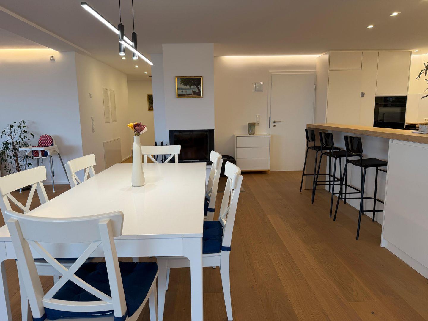Die moderne, offene Küche ist vollständig ausgestattet mit Induktionskochfeld, Backofen, Kühlschrank mit Gefrierfach, Spülmaschine sowie Kaffeemaschine, Wasserkocher und weiteren Küchengeräten. Der großzügige Essbereich bietet ausreichend Platz für gemeinsame Mahlzeiten.