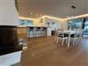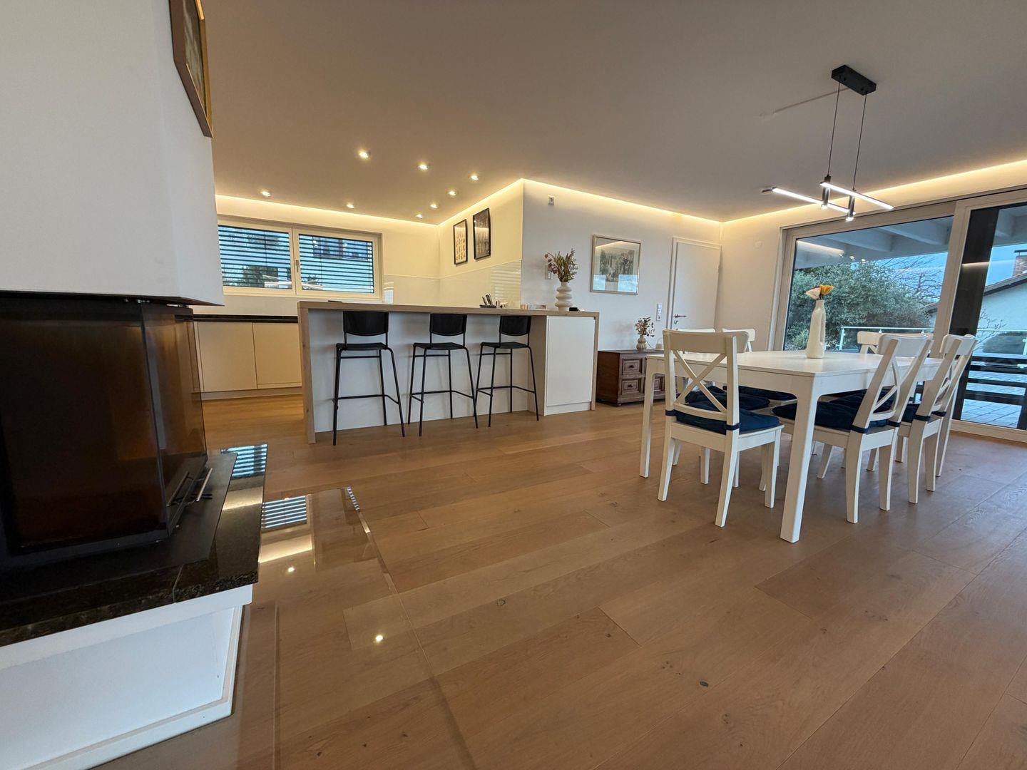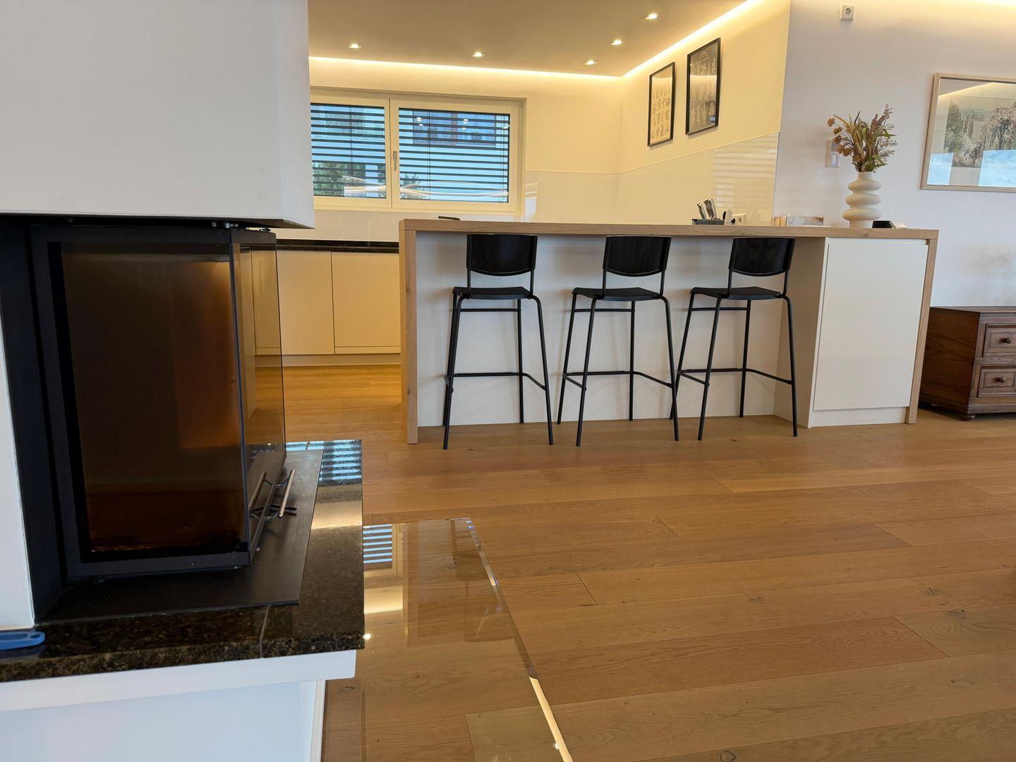 Der offen gestaltete Wohn- und Essbereich überzeugt durch Großzügigkeit und hochwertige Ausstattung. Edles Parkett, eine komfortable Sofalandschaft, ein Kaminofen sowie ein großer TV mit internationalen Kanälen schaffen eine stilvolle Atmosphäre. Schnelles WLAN mit über 100 Mbit/s sorgt für zeitgemäßen Komfort – ideal auch für längere Aufenthalte.