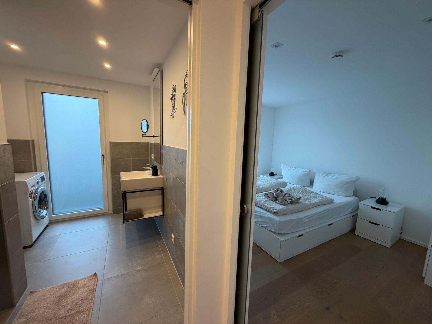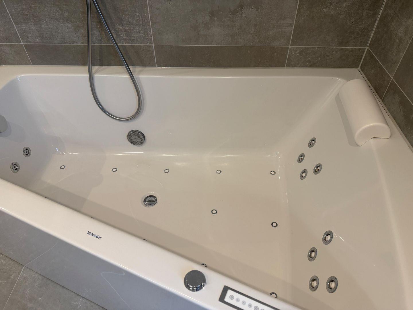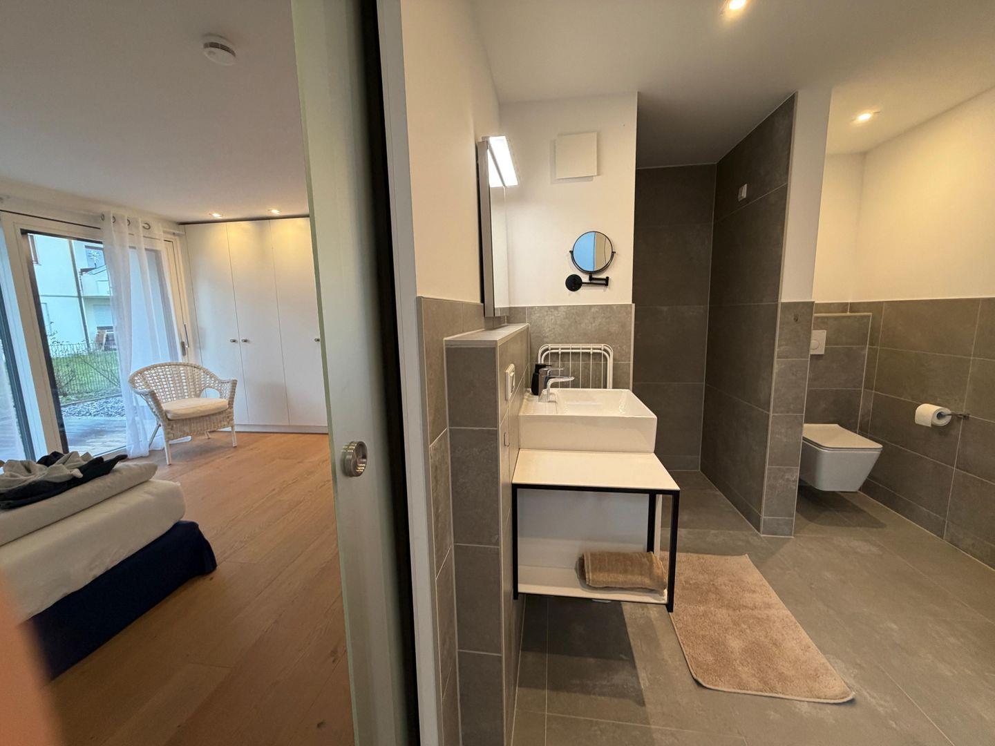 Beide Badezimmer sind hochwertig gestaltet und verfügen über bodengleiche Duschen. Zusätzlich lädt eine Whirlpool-Badewanne im Innenbereich zu entspannenden Wellnessmomenten ein – perfekt nach einem Tag am Bodensee.