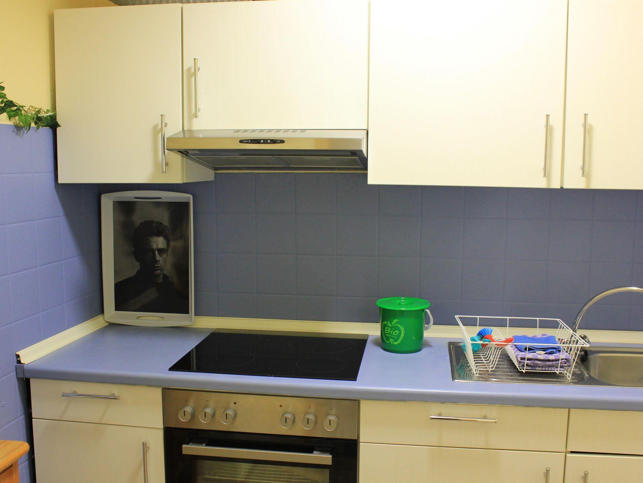Im Flur befindet sich eine Garderobe. Sie verfügt über ein Badezimmer mit Dusche und WC, ein Schlafzimmer mit 2 Einzelbetten und eine voll ausgestattete Küche mit Backofen und Cerankochfeld. Im kombinierten Wohn-/Schlafraum befindet sich die Essecke, Sat-TV, Sofa und hinter einem Vorhang ein Doppelbett.