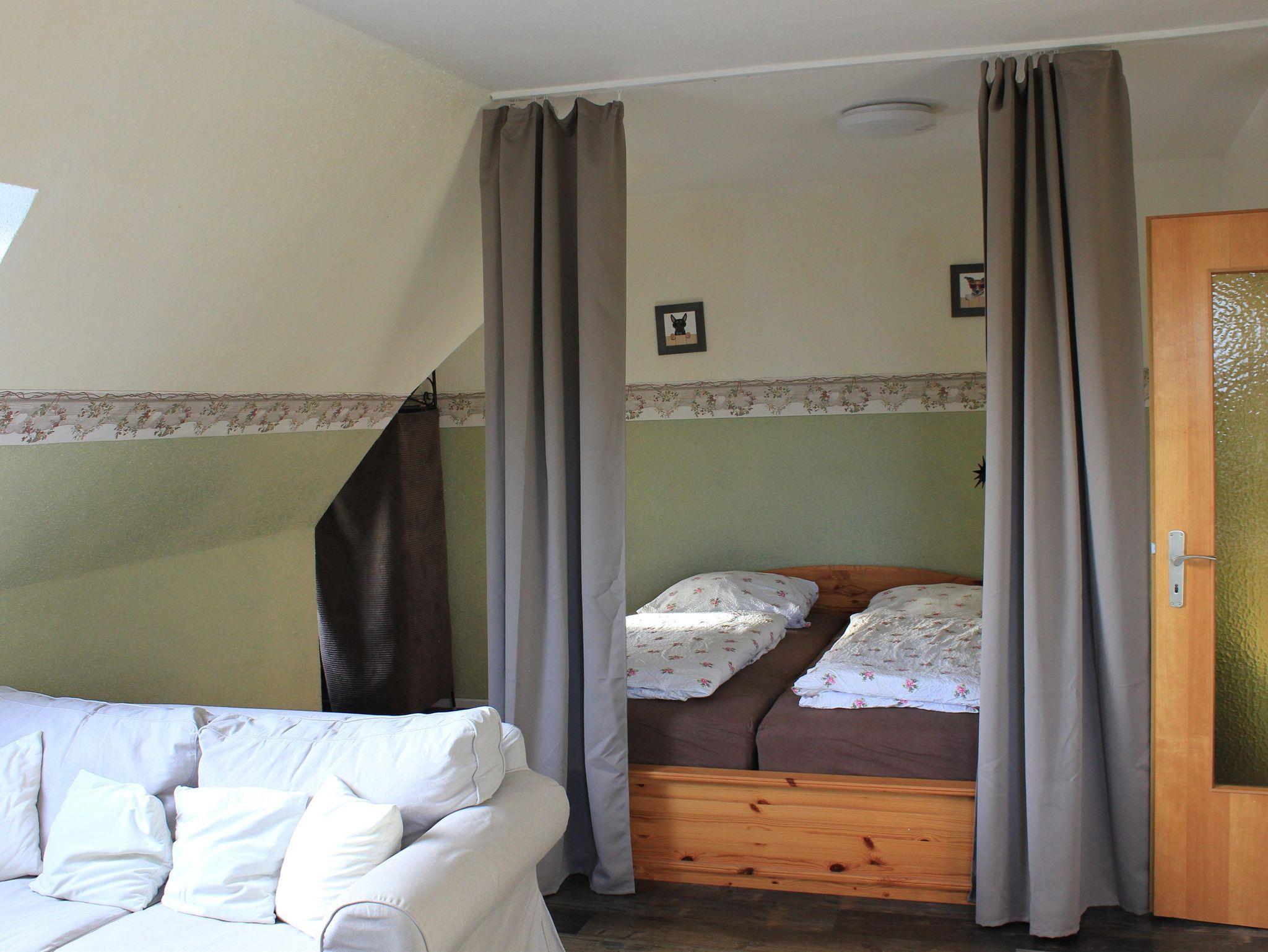Die Ferienwohnung Hauke ist ca. 56 qm groß und bietet bis zu 4 Personen Platz. Sie befindet sich im 1. Obergeschoß des Haupthauses und ist über ein Treppenhaus mit Steintreppe zu erreichen.