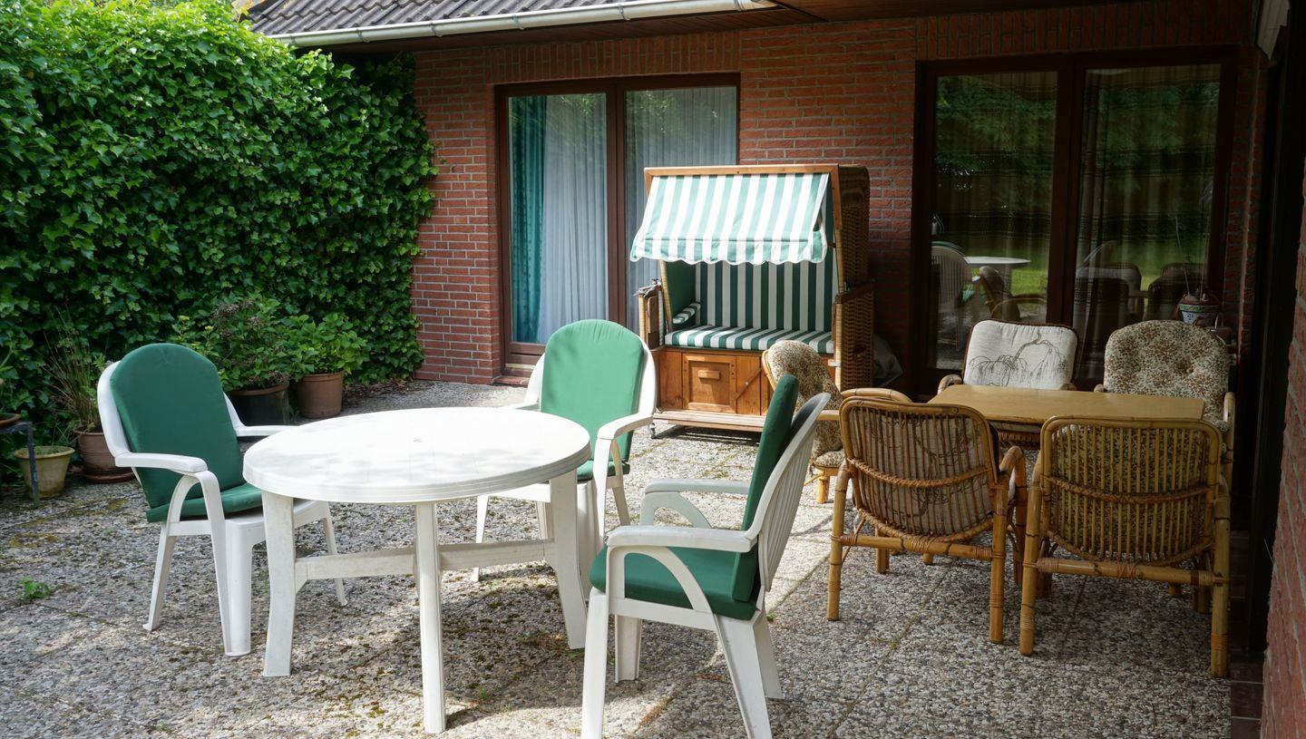 Der große, naturbelassene Garten mit möblierter Terrasse und Strandkorb lädt zum Entspannen ein. Im Garten ist eine Wäschespinne vorhanden für längere Aufenthalte. Zwei Parkplätze stehen direkt am Haus zur Verfügung.