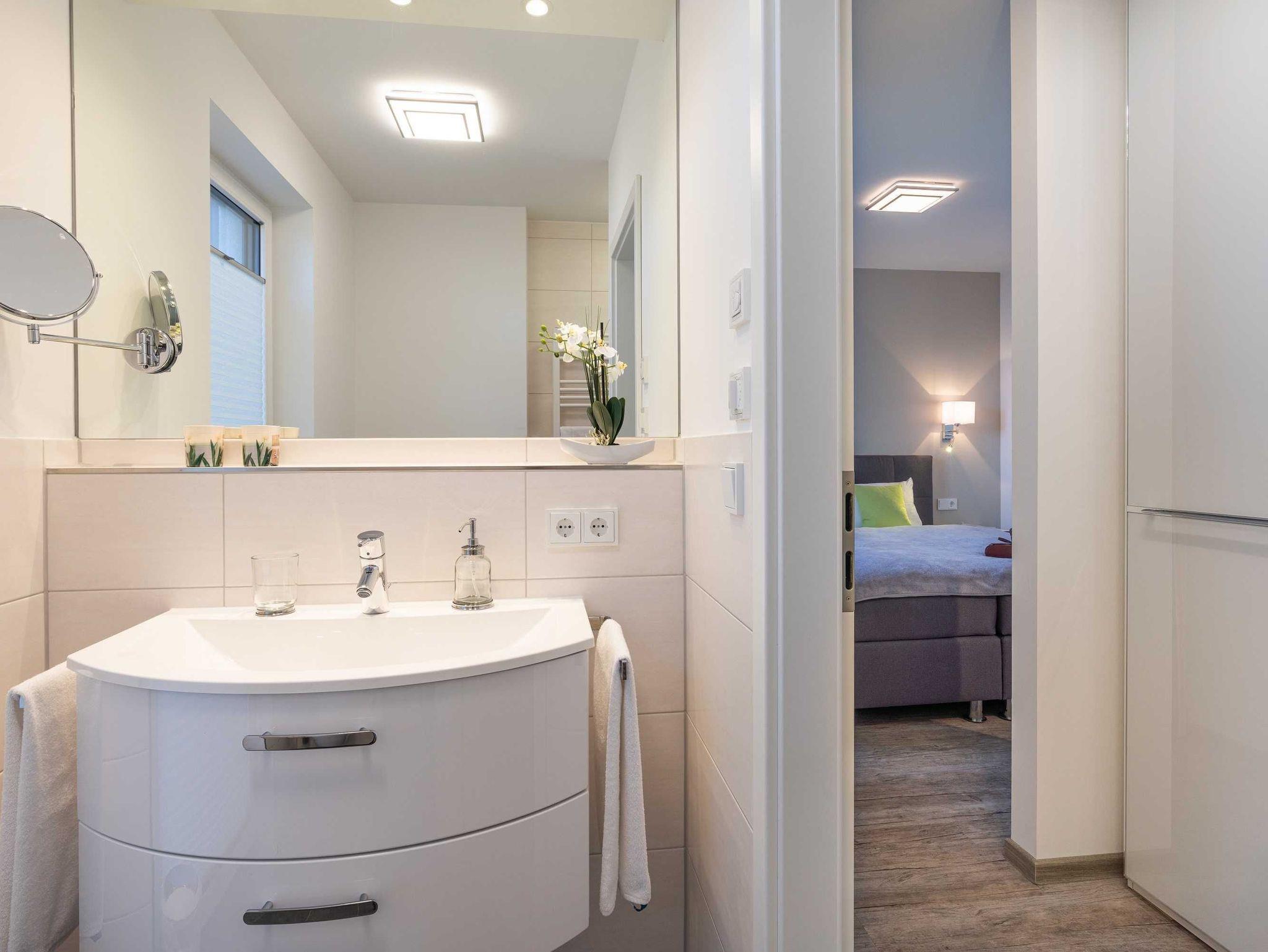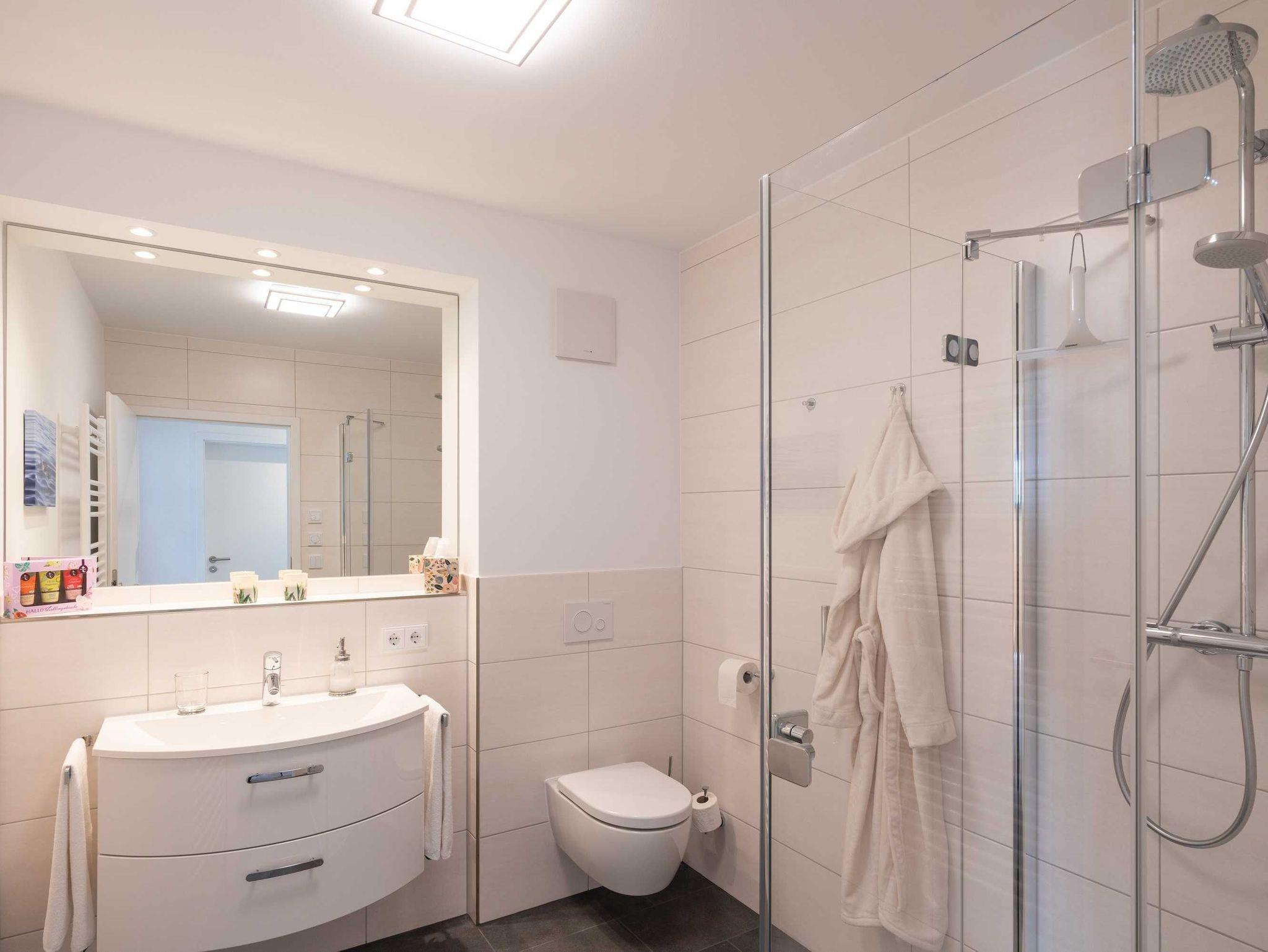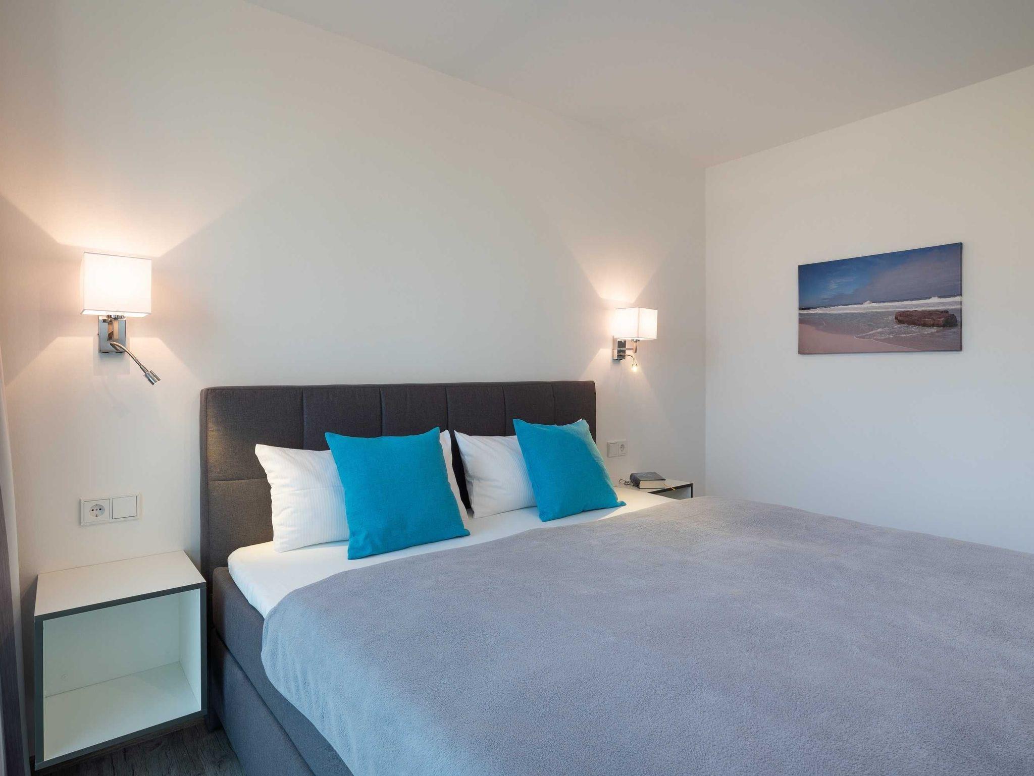 Diese luxuriöse 4-Zimmer-Wohnung im Erdgeschoss von Haus 7 mit Platz für maximal 6 Personen verfügt über eine Wohnfläche von 100 m² und hat 3 Schlafzimmer sowie 2 voll ausgestattete Duschbäder. Die große Sonnenterrasse mit 21 m² liegt in idealer Süd-Ausrichtung. Die Wohnung ist modern eingerichtet mit offenem Wohn-Essbereich, großem Esstisch, Ledersofa sowie Smart-TV (inkl. Sky-Abo). Die hochwertig ausgestattete Küche, offen zum Wohnbereich, lässt keine Wünsche offen. Erholsamer Schlaf in den beiden Schlafzimmern mit Boxspringbetten und Smart-TV ist garantiert. Im dritten Schlafzimmer befindet sich ein bequemes Schlafsofa (Liegefläche: 1,60 x 2,00 m) und ein Smart-TV. Das Badezimmer en Suite ist mit einer begehbaren Dusche ausgestattet. Auf der großen, überdachten Sonnenterrasse mit Essgruppe und jeweils zwei Relax-Sesseln samt Fußhockern, Sonnenschirm und Sonnenliegen können Sie die Seele baumeln lassen.