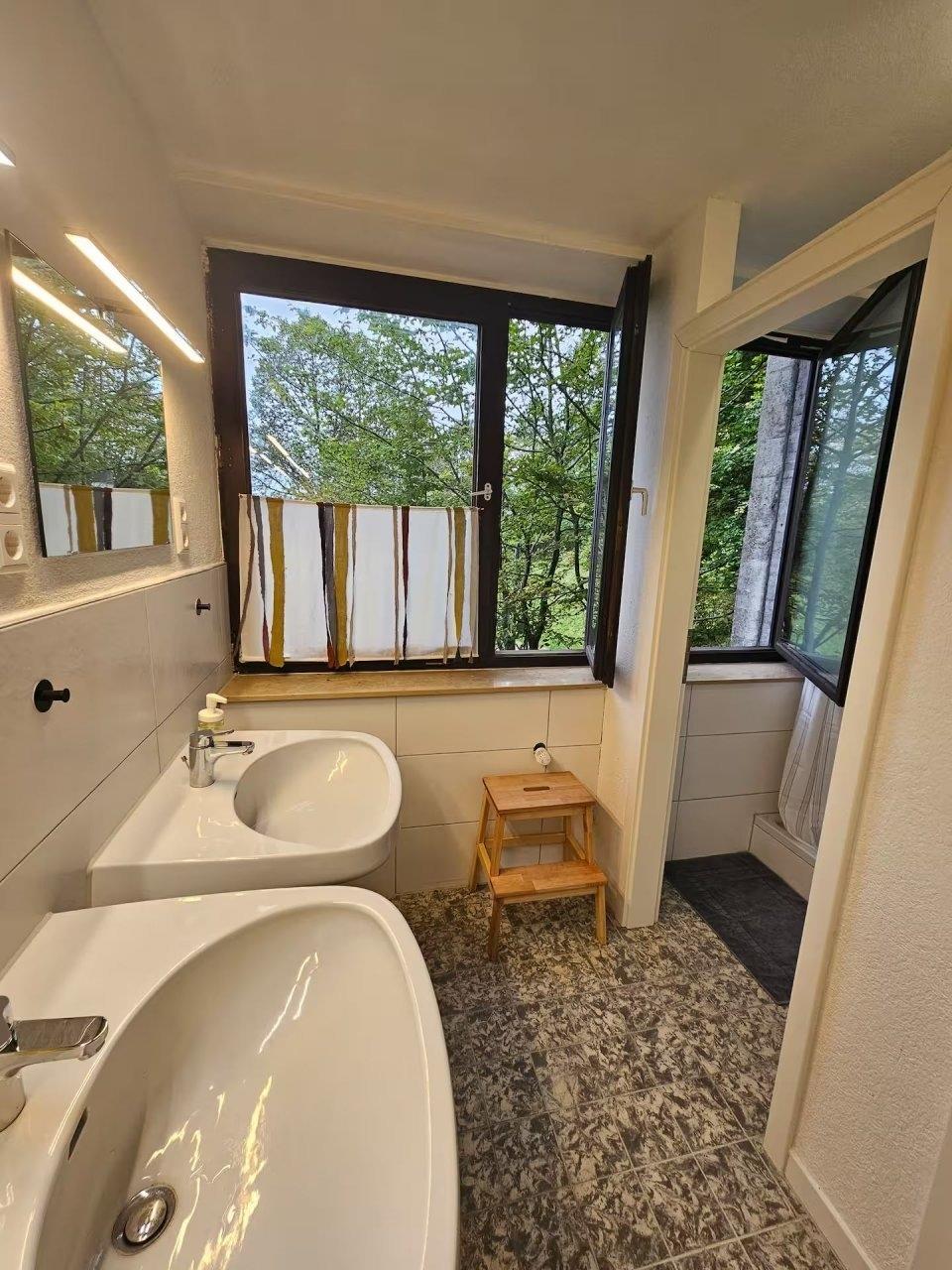Zwei Gemeinschaftsbäder mit je einer Dusche und WC liegen auf der selben Etage, ein weiteres Bad mit 2 Duschen und 2 WCs einen Stock höher.