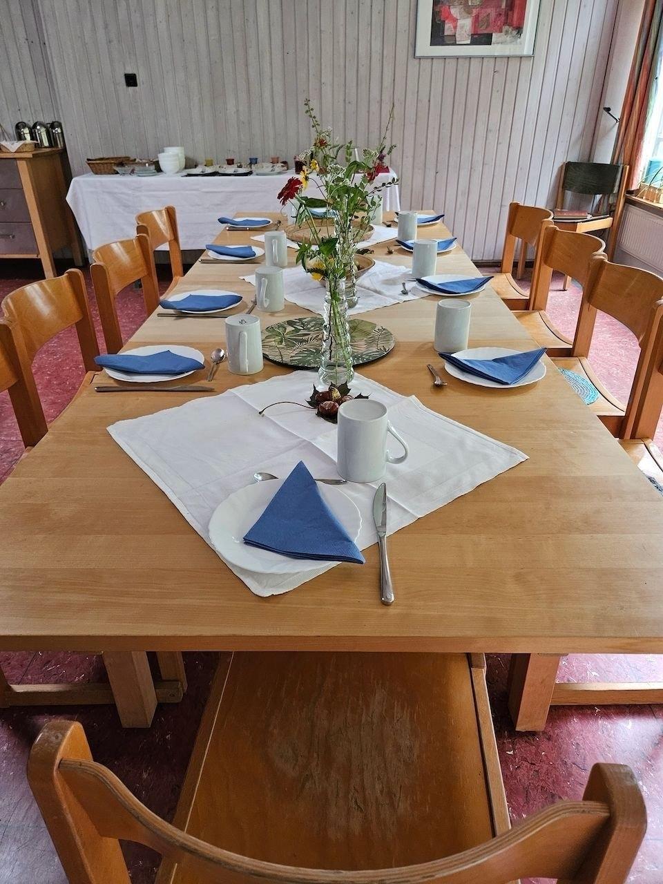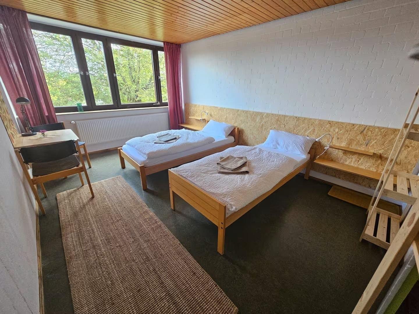 Dieses Zimmer verfügt über 2 getrennte Betten, welche man auch zusammenstellen kann. Ein Gemeinschaftsbad mit 2 Duschen und 2 Toiletten liegen auf der selben Etage, 2 weitere Bäder einen Stock tiefer.