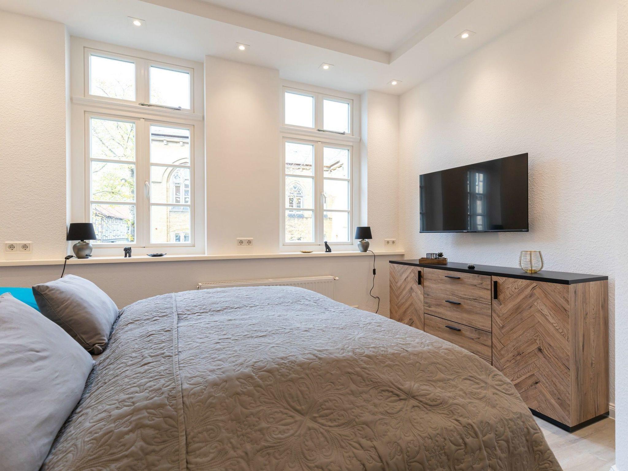 Marktplatz, ca 65 qm großes Appartement mit 2 Schlafzimmern mit Boxspringbetten (Bettwäsche 155x220 cm). Ein Duschbad ist vorhanden und eine Gästetoilette. Eine helle offene Wohnküche vervollständigt das Appartement. Außerdem haben wir unsere Terrasse mit Gasgrill für dieses Appartement fertiggestellt.