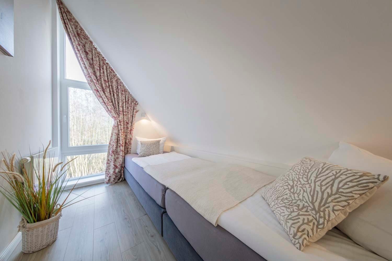 Zimmer 1 mit Doppelbett im Erdgeschoss, Zimmer 2 mit zwei Einzelbetten und Zimmer 3 mit einem Einzelbett. Die gemütlichen Boxspringbetten vereinen Design und hohen Schlafkomfort.