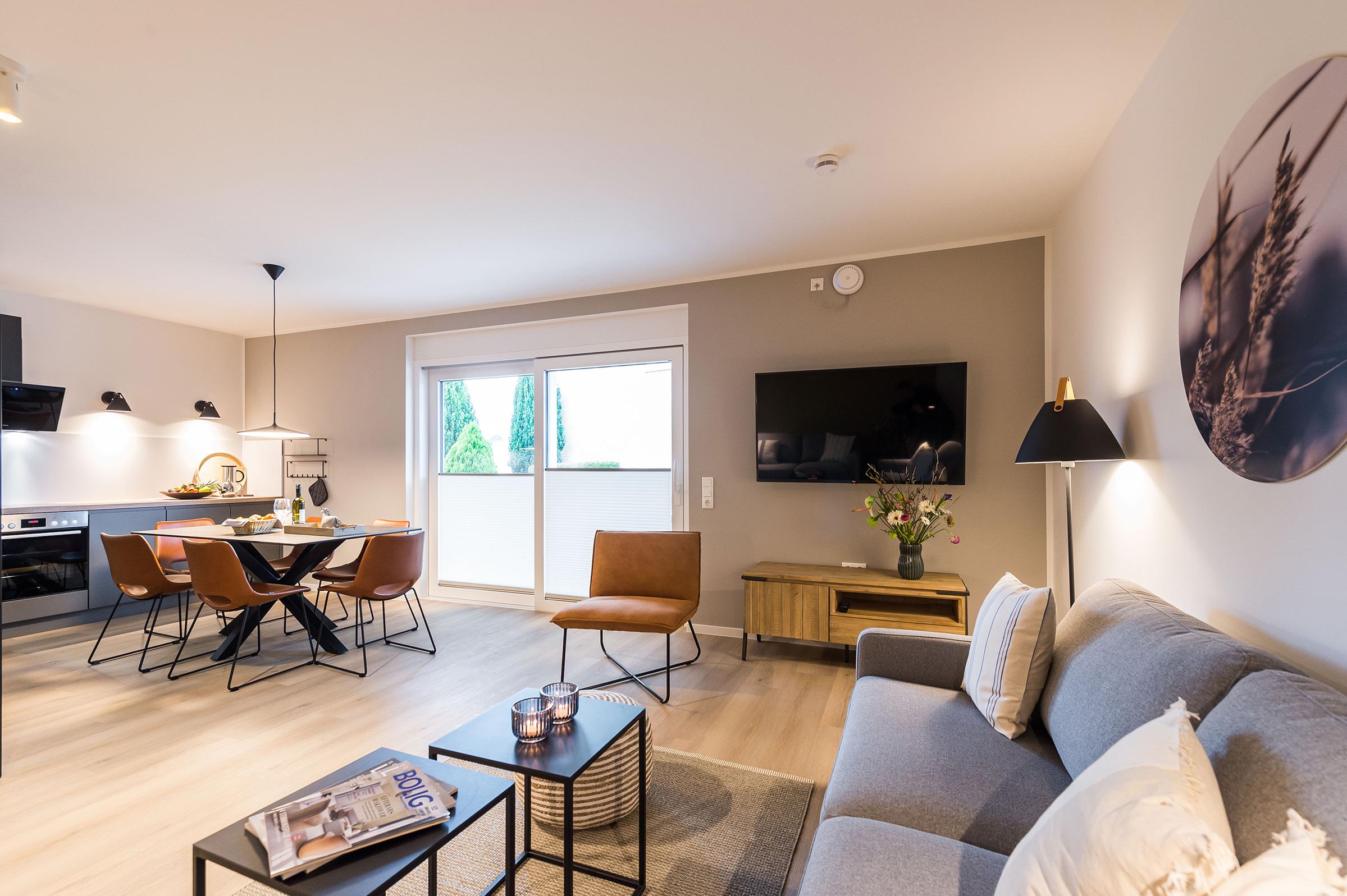 Sie ist für bis zu 6 Personen buchbar (2 Schlafzimmer mit Doppelbetten 180 x 200 cm, 1 Schlafzimmer mit Doppelbett 140 x 200 cm) (der angegebene Preis bezieht sich immer auf 2 Erwachsene und 2 Kinder, extra Personen können ggf. auf Anfrage dazu gebucht werden) und verfügt über eine gehobene 5-Sterne-Ausstattung: 2 Badezimmer, 1 Sauna, 1 Whirlwanne sowie 1 Terrasse. Die Küche ist komplett ausgestattet und bietet einen großen Esstisch für bis zu 6 Personen. Zudem gibt es einen Geschirrspüler, einen Kühlschrank inkl. Gefrierfach, eine Mikrowelle sowie einen Waschtrockner. Im Wohnbereich erwartet Sie ein 55-Zoll-Smart-TV sowie der Zugang zur großzügigen Terrasse. Die Terrasse ist ebenfalls mit einem großen Esstisch ausgestattet. Selbstverständlich bieten wir schnelles und kostenfreies WLAN sowie einen PKW-Stellplatz direkt am Haus. Auf den hauseigenen Parkplätzen stehen Ihnen E-Auto-Ladegeräte (Wallboxen) zur Verfügung (gegen Gebühr).Aufgrund der Allergiker gerechten Ausstattung sind Haustiere nicht erlaubt.