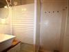 Helles, modernes Bad mit Dusche + Trennwand, WC und Waschbecken incl. Unterschrank.