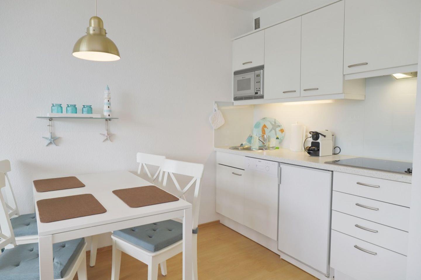 Die gut ausgestattete Küche ist offen gestaltet und perfekt in den Wohnraum integriert. Der angrenzende Essplatz ist für bis zu 2 Personen ausgerichtet. Bereiten Sie hier problemlos Ihre Mahlzeiten zu und genießen Sie gesellige Kochabende zu zweit.