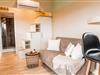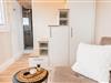 Es bietet auf 23 qm Platz für bis zu vier Personen. Unten gibt es eine komplett ausgestattete Küchenzeile mit Herd und Kühlschrank, eine bequeme Schlafcouch (1,40 cm) und ein Bad mit Dusche und WC. Über eine Treppe erreicht man die gemütliche Schlafempore. Die 12 qm große Terrasse ist zudem eine Verlängerung des Wohnraumes nach draußen.